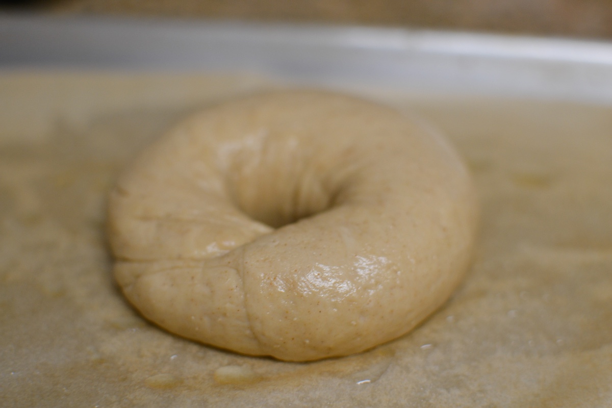 Once shaped oil the tops of the bagels and press down on them slightly to flatten. This will help avoid them from rising into buns and will hold their shape. Cover and let rest overnight in the fridge.