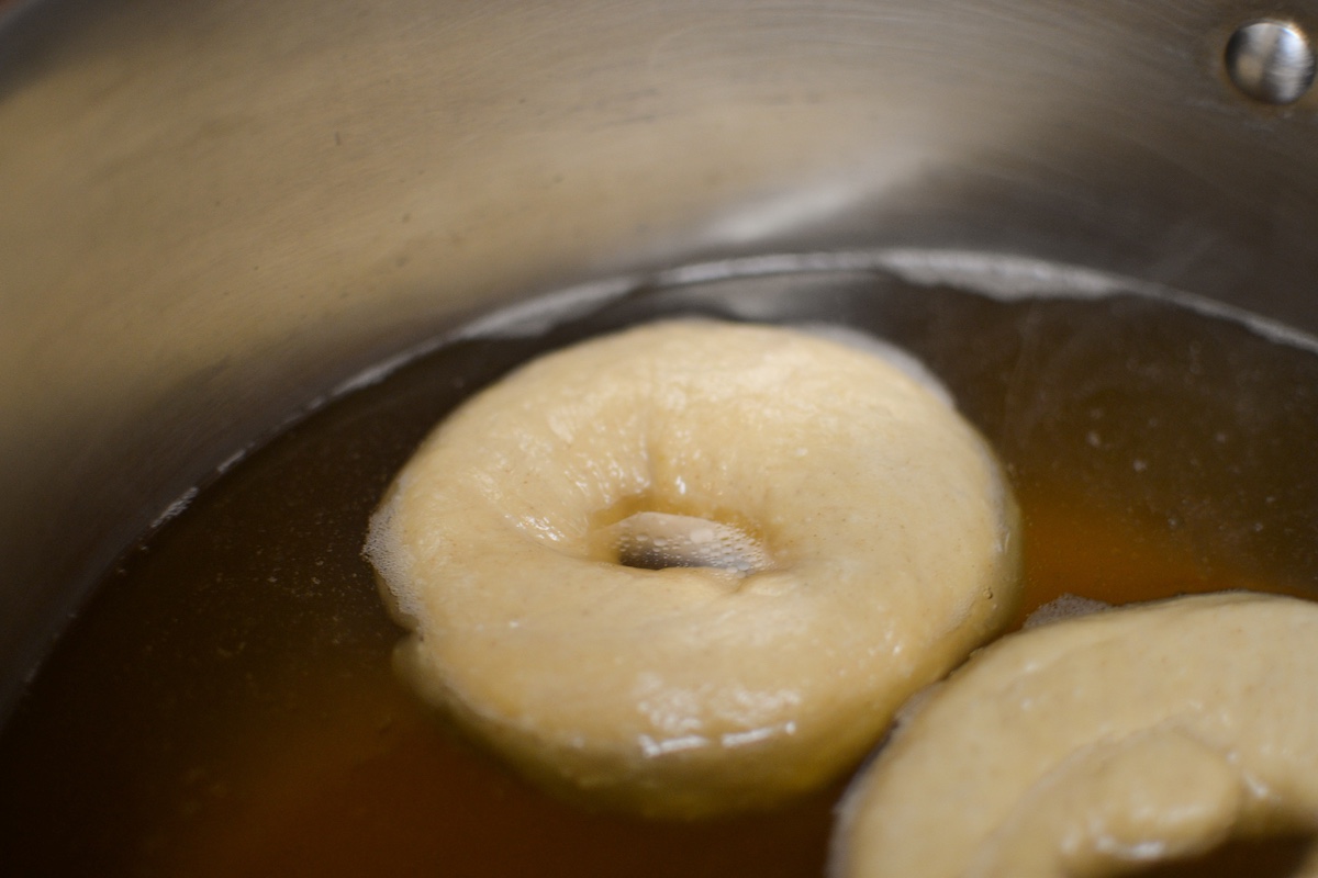 There are 2 ways to shape. The first way is to roll the dough into a snake then bring the two ends together to form a bagel shape. Roll the connected pieces together to seal. The second way is to press your thumb into dough ball and rub until a hole is formed. Stretch the dough to by pulling from the inside to elongate the dough and form a bagel shape. This way will make them less chewy but is a bit easier.