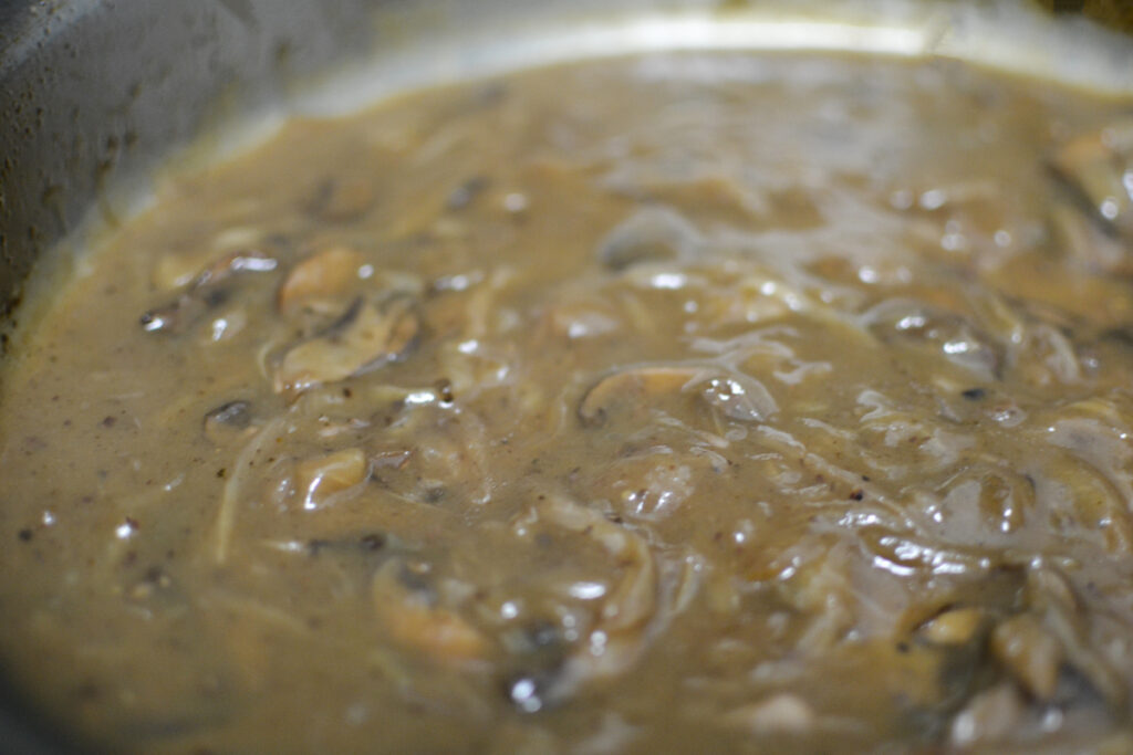 Thinly slice the onions and mushrooms. Add to the pan and season with salt and pepper. Cook until the onions are caramelized and mushrooms browned, around 10 minutes. As they cook scrape the bottom of the pan to remove the fond.
