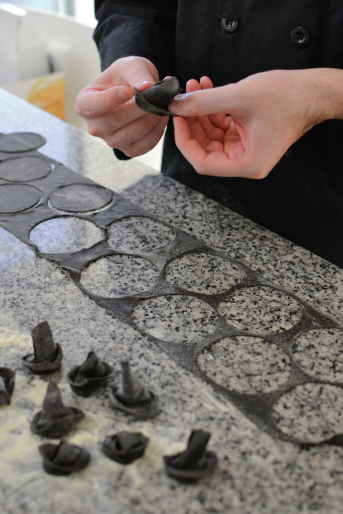 Homemade Cappellacci dei Briganti made with squid ink pasta.