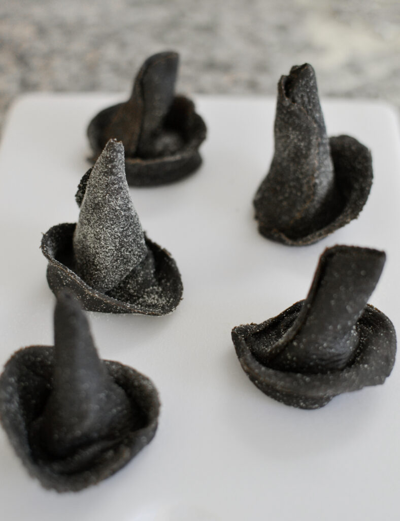 Using an inverted liquor glass or round cookie counter, cut round disks out of the pasta. Fold the disk over your index finger to form a cone then flip over the base to form the brim of the hat. You can re-roll the scraps of pasta dough or cut into pieces and cook alongside your cappellacci to avoid any waste!