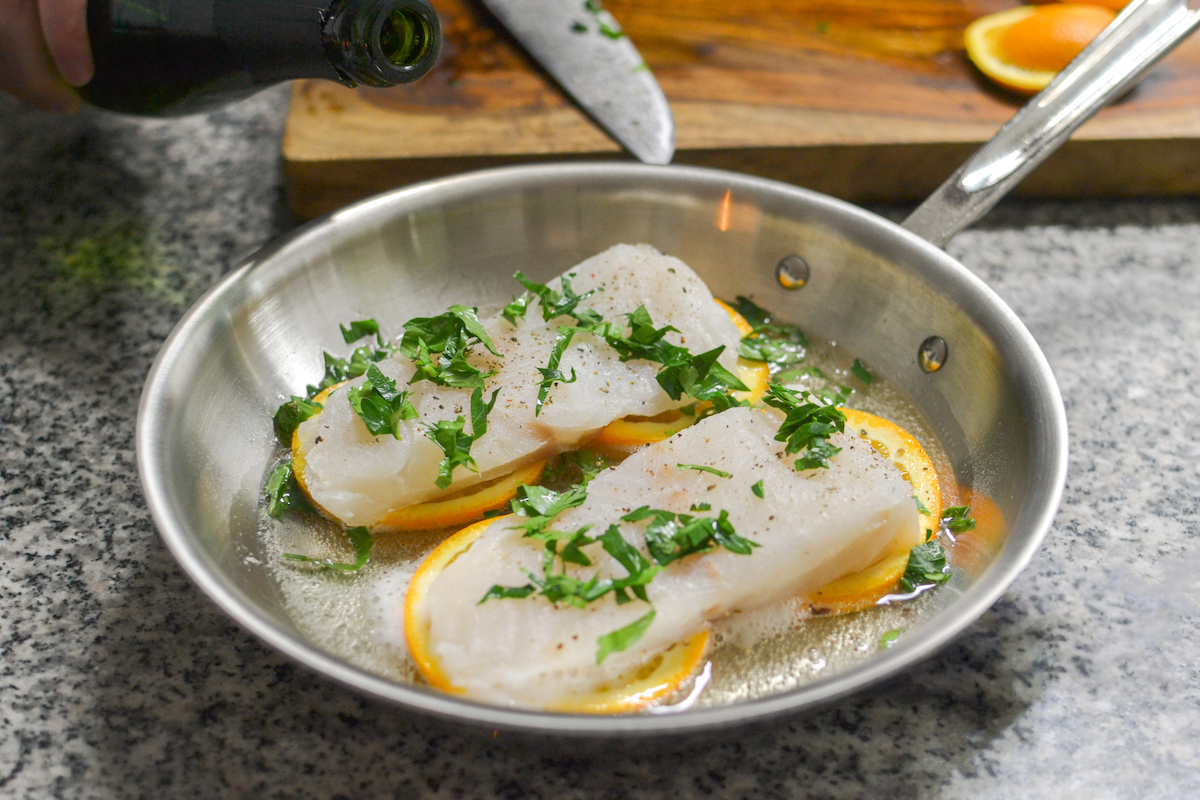 This elevated version of steamed cod is the perfect summer dish. The cod is light, flaky and delicate with subtle notes of orange and champagne.