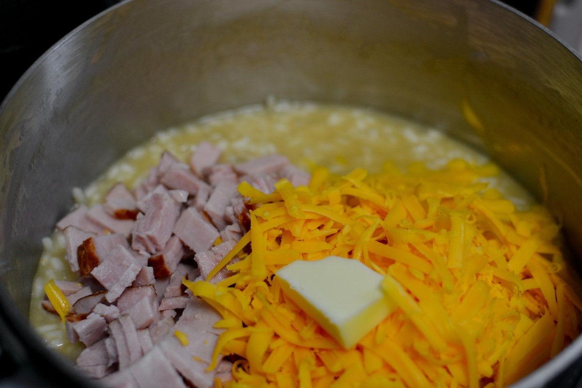 Cheese rice and ham was a favorite of mine growing up. Unlike the childhood kind that used Velveeta cheese and minute rice, this is a more refined version. A classic risotto is already creamy and the addition of cheddar makes it extra luxurious and creamy.