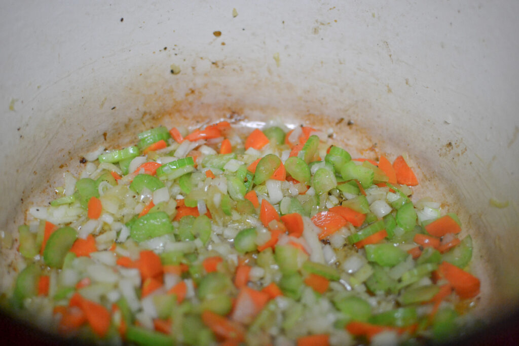 Add 1 tbs olive oil to a Dutch placed over medium heat. Season your chicken with salt and pepper and sear on both sides. Remove from the pan and add set aside. Add chopped carrots, celery and onions. Season with salt and pepper. Cook until the carrots soften. Add the chicken back to the pan and toss in the garlic. Cook for 30 seconds then add the white wine. Cook for another 5 minutes. Add the tomatoes, water and thyme. Turn the heat down to low, cover and simmer for 2 hours. Remove the lid and cook for another 30 minutes. This will allow the sauce to thicken up.