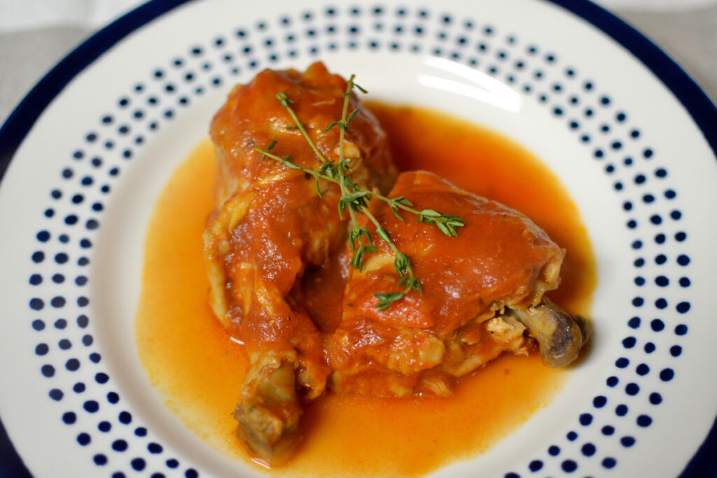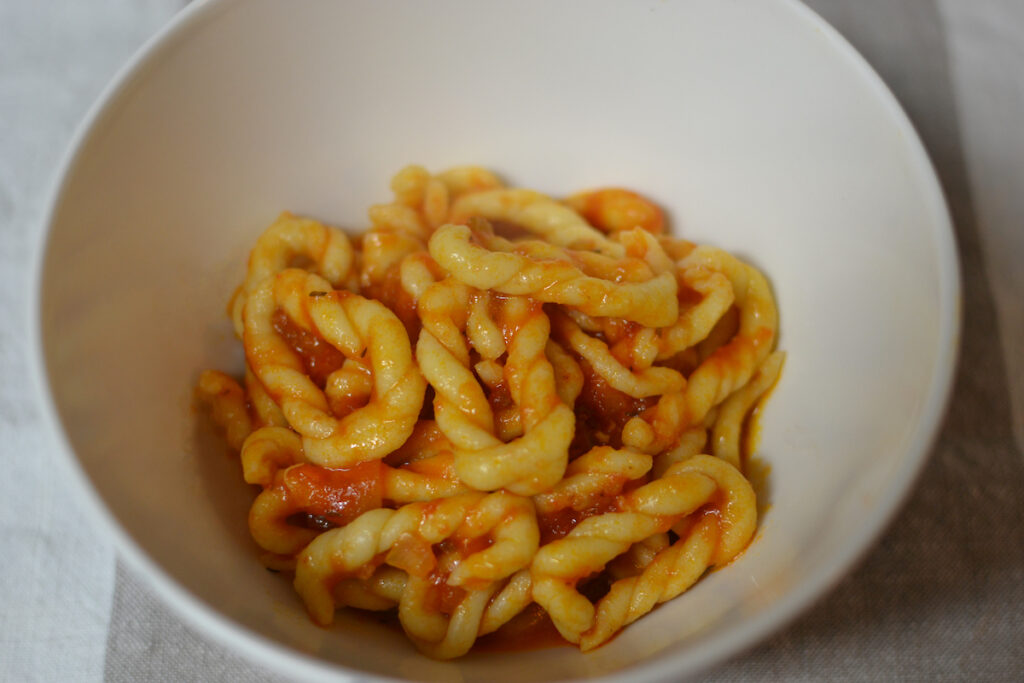 When most people here ragù chicken doesn’t come to mind. However, in the italian region Sardinia this is the classic sauce for lorighittas. The chicken melts off the bone in this slow braised tomato sauce. The chicken is served for the second course with the pasta and sauce being the first.