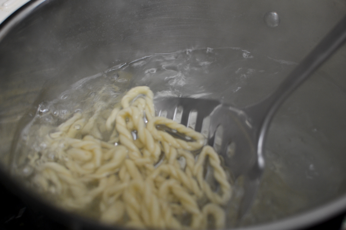 Cook your pasta in a large pot of salted water. If using dried lorighittas, cook for around 12 minutes or until al-dente. Remove from the water and add to a bowl with the sauce. Mix to coat all the pasta then serve.
