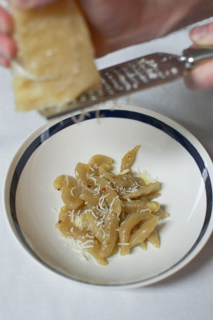 This unique yeasted pasta is a quick weekday meal and one of my go to’s. I tend to make bread on the weekends and set aside some of the dough in the fridge to be able to make these during the week. The pasta is similar to a dumpling and takes on the flavor of the bread dough that is used.