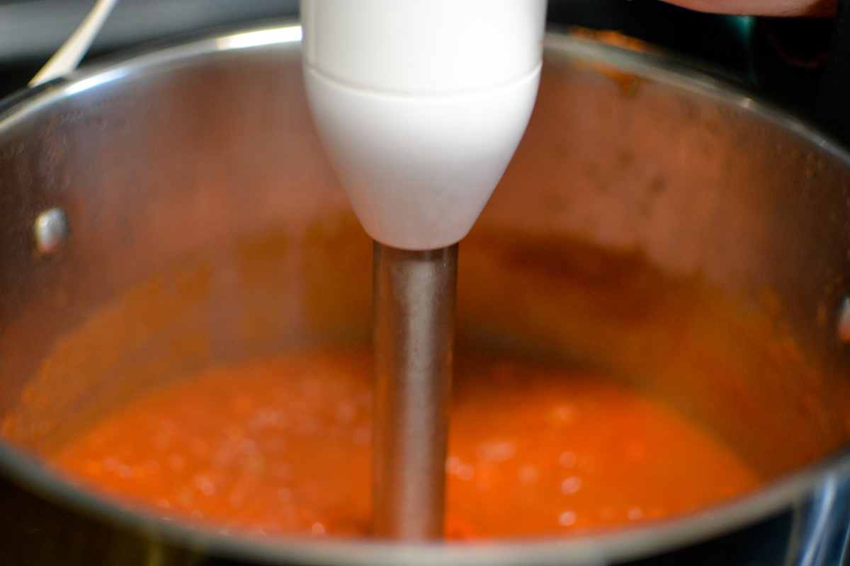 If you prefer a smooth sauce, you can blend the sauce using an immersion blender or a food mill. The food mill is the better option as it doesn't break down the vegetables as much.