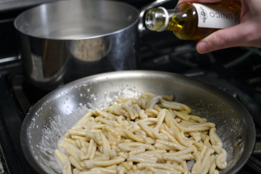 Strain and add the pasta to a skillet. Do not turn on the heat.