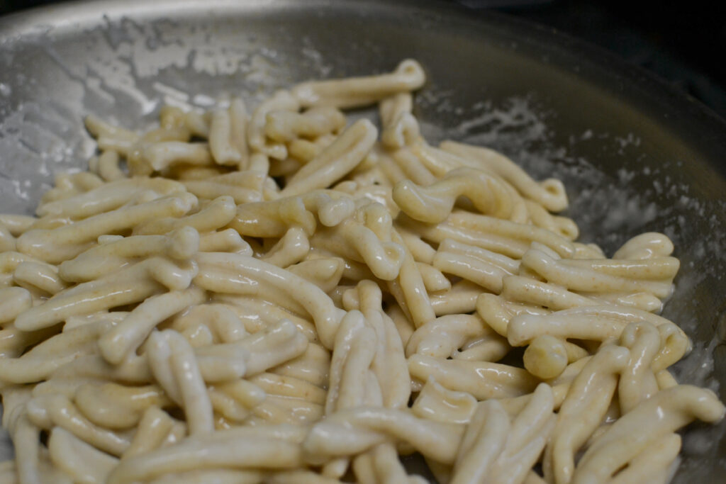 This decadent pasta dish is an adult and luxurious version of mac n cheese. The technique is similar to cacio e pepe and does not use any actual cream to give the pasta its creaminess. It is all how the cheese is melted and tossed with the pasta.