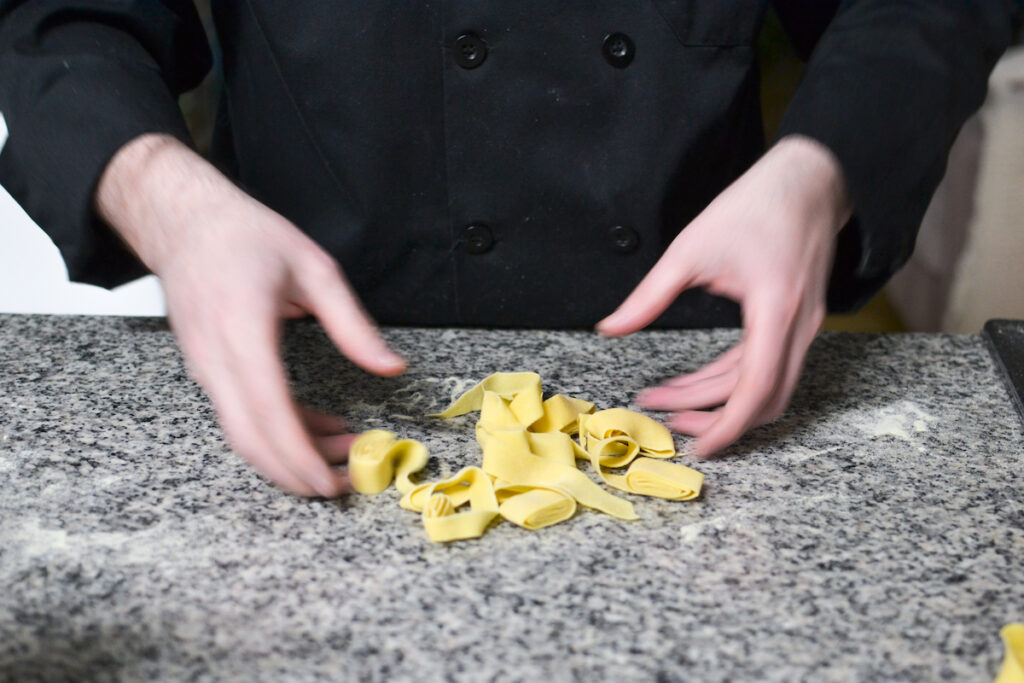 Cut the rolled dough into the desired length. Dust with flour and gently roll up lengthways. Cut into 2-3cm widths. Scoop up the pappardelle with your fingers and let fall down. This will open and separate the pasta. Gently flour and set in a nest.