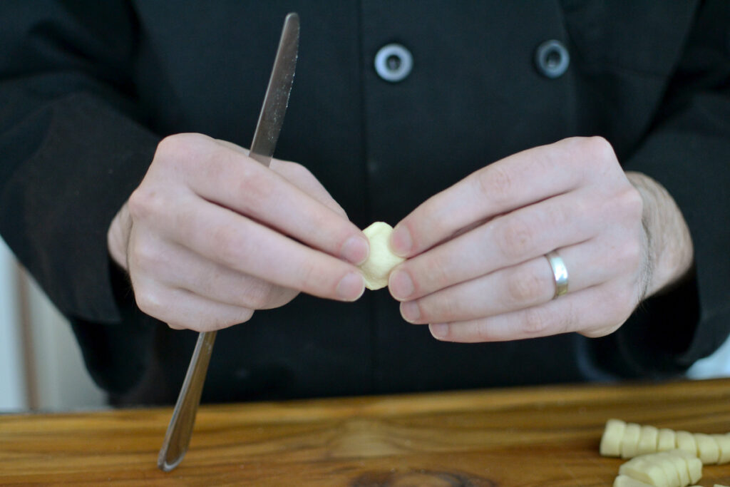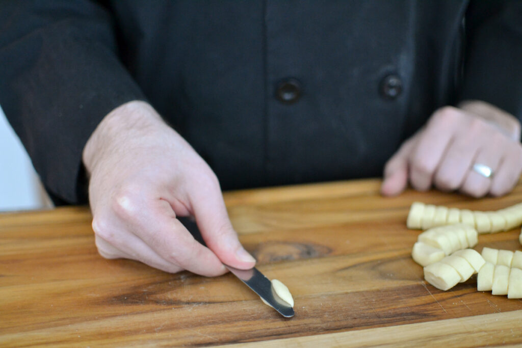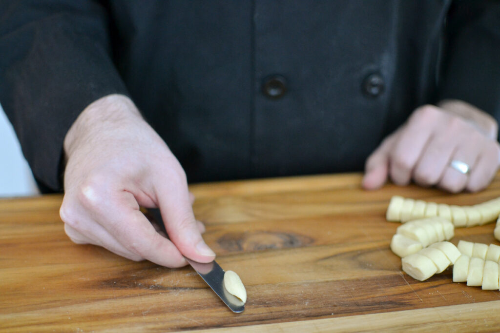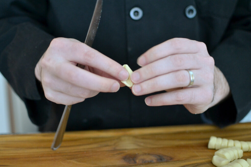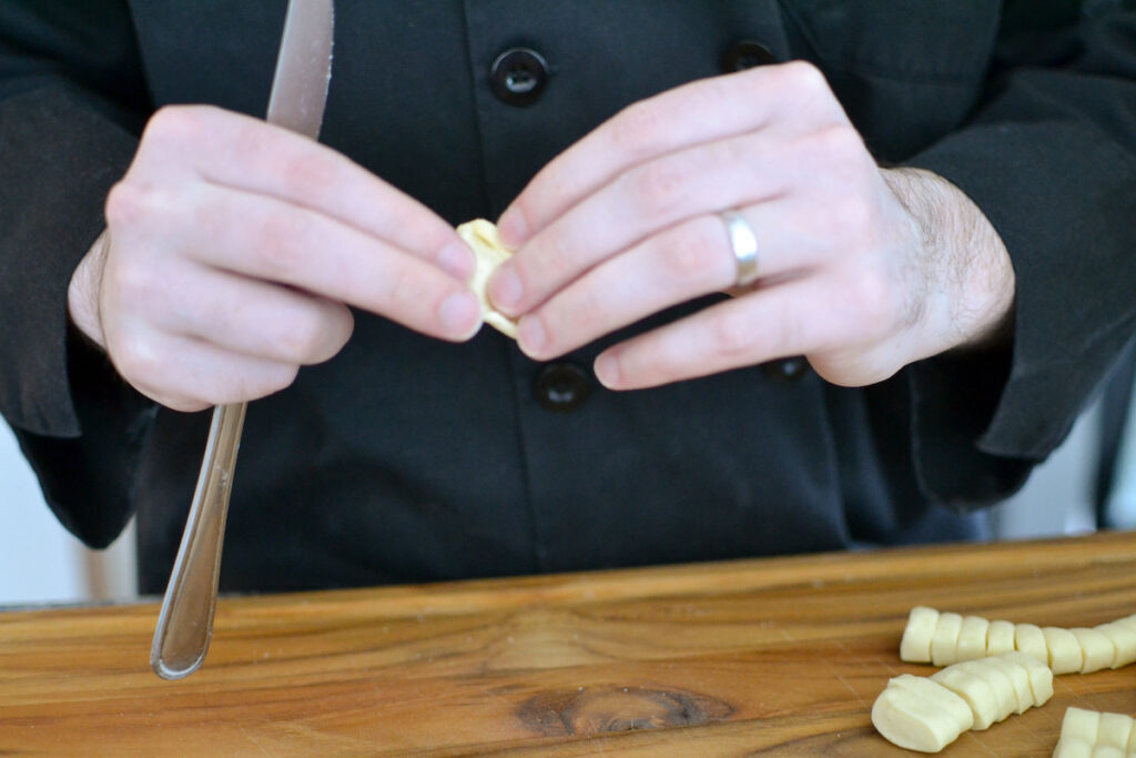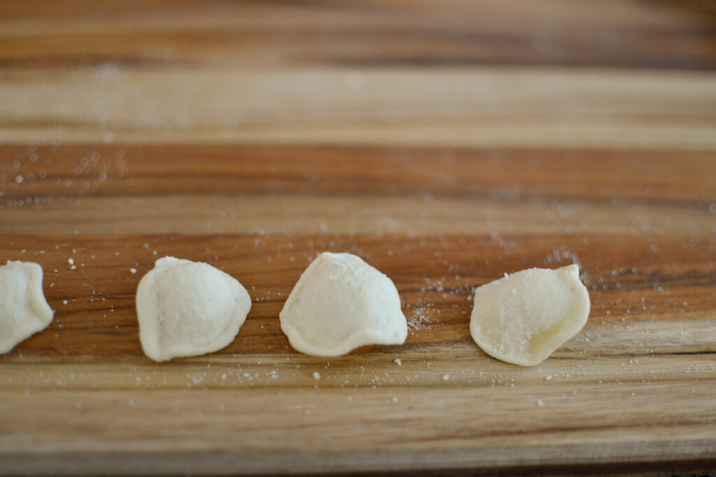 Roll the dough into a snake around 1/2" diameter. With a bench scraper or knife, cut the dough into 1/4-1/2" pieces depending on the final size you would like. Place the a dull knife on the edge of the dough and press down, dragging the dough. Remove from the knife and fold inside out to create an 'ear' shape.