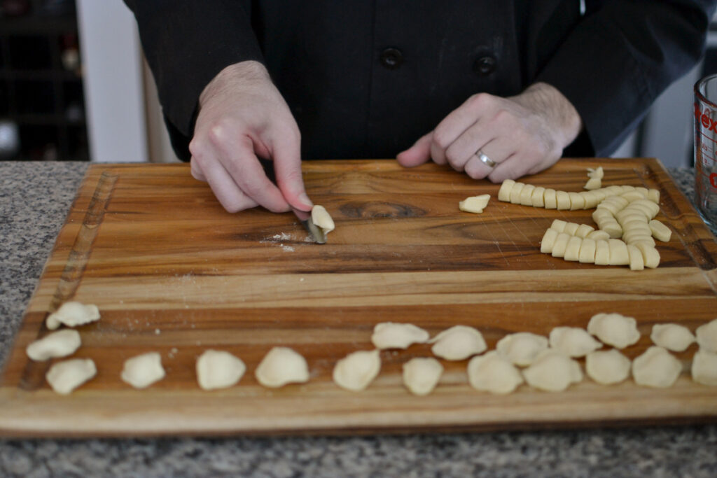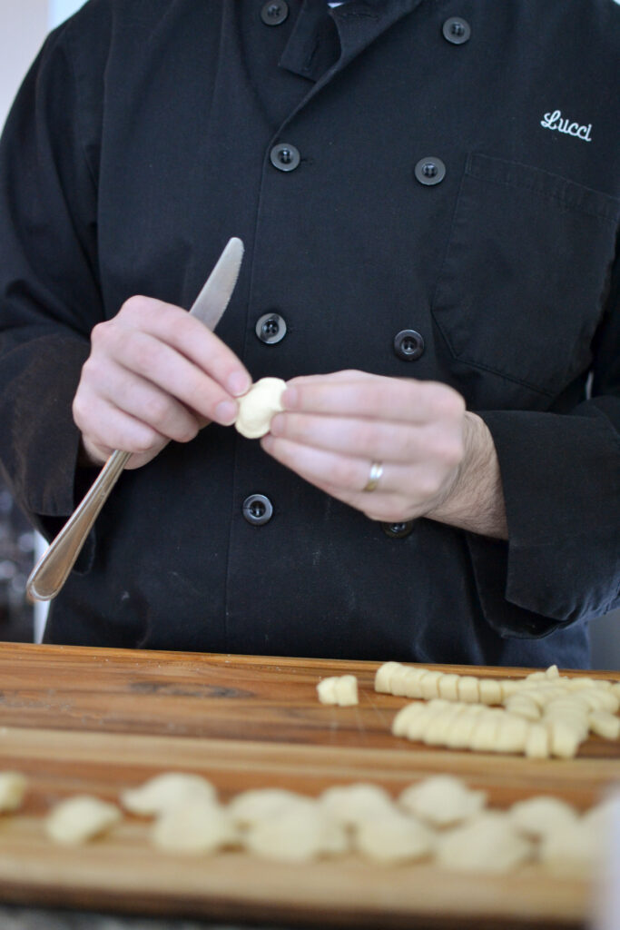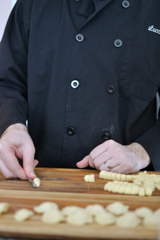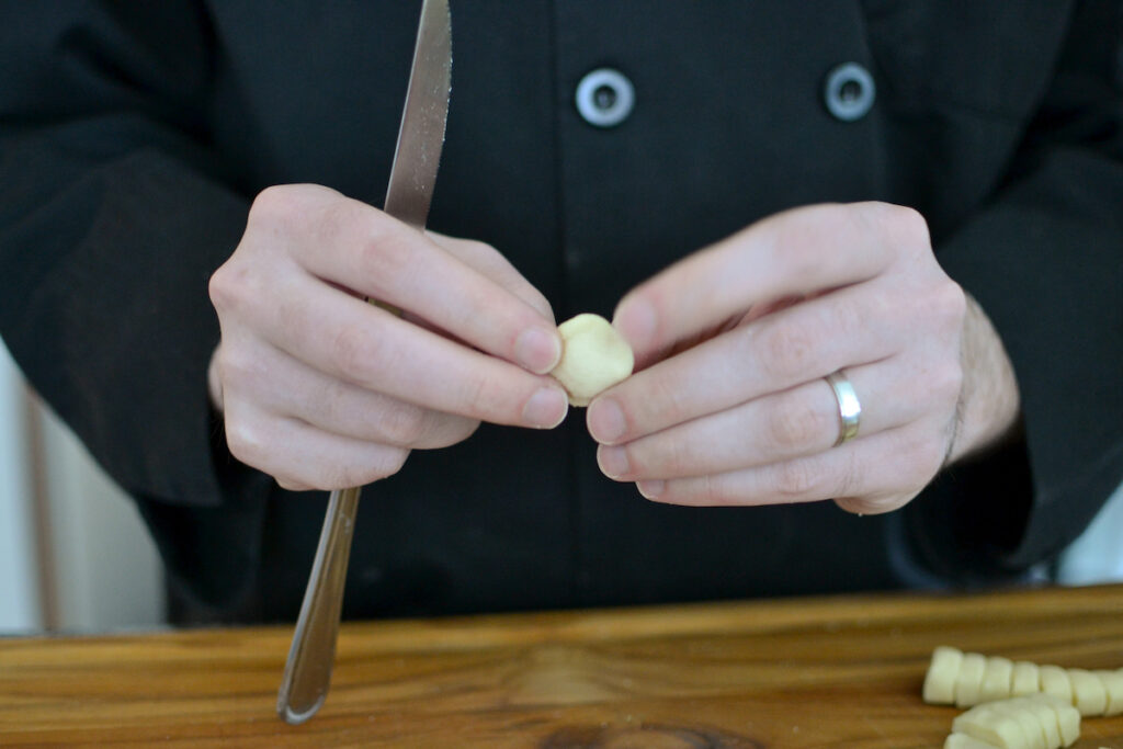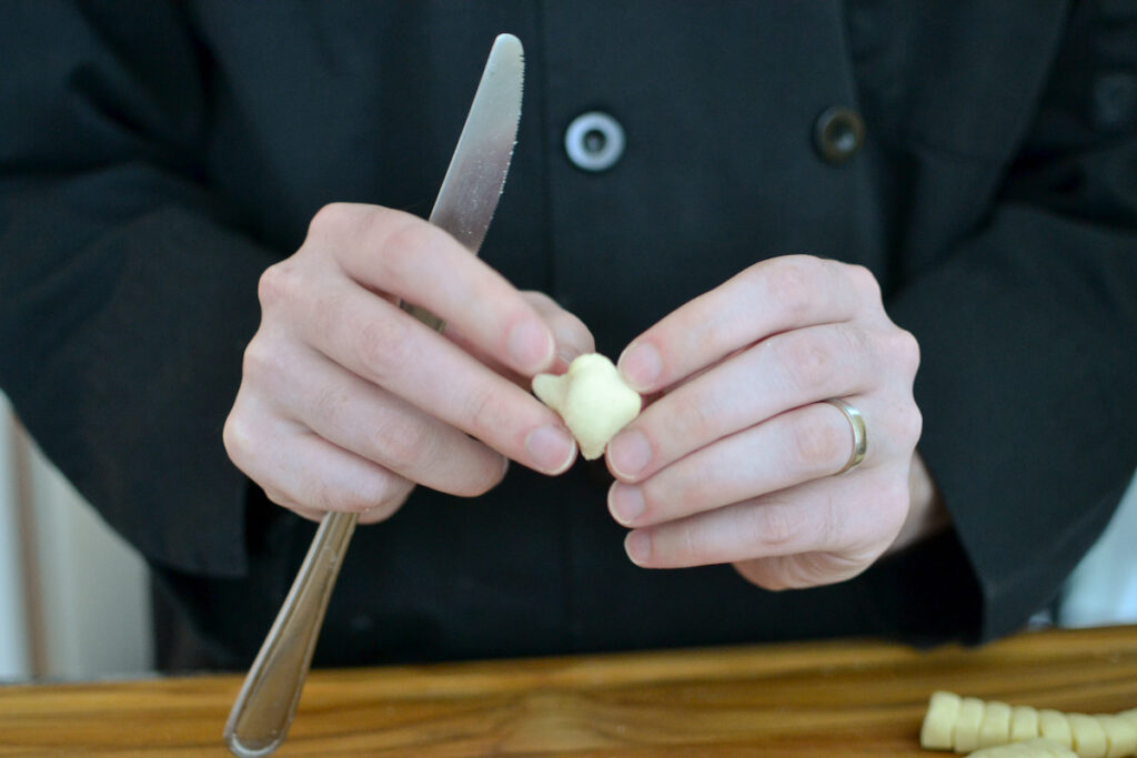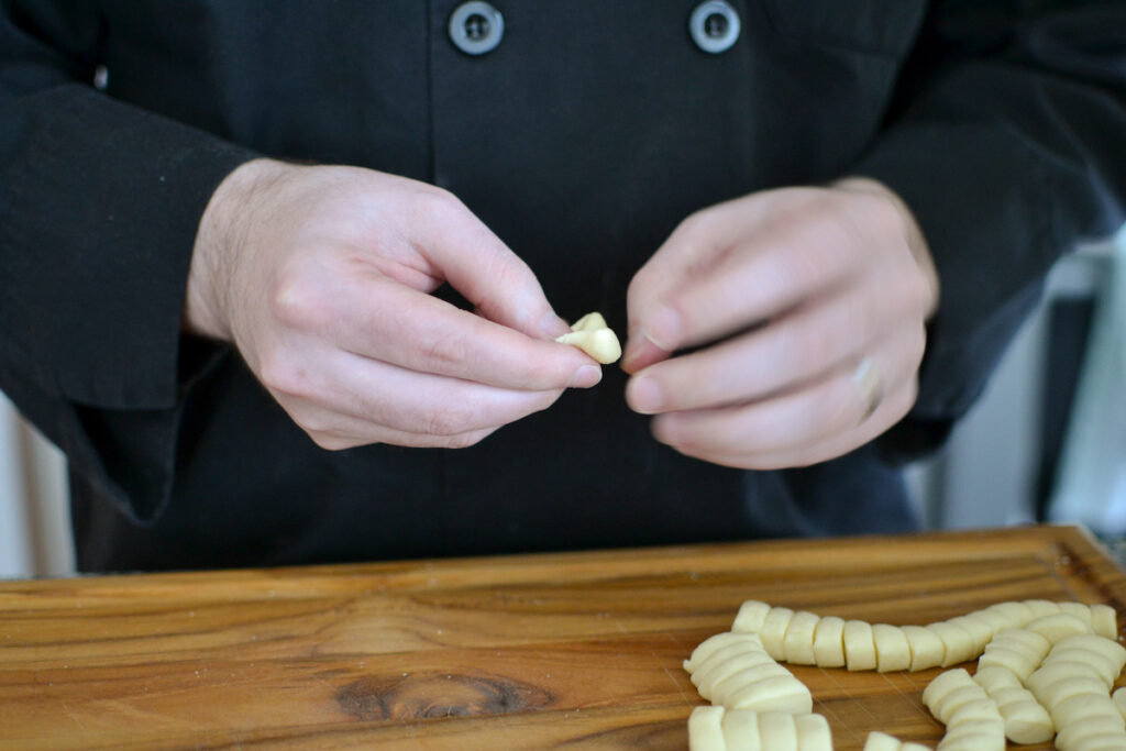 Roll the dough into a snake around 1/2" diameter. With a bench scraper or knife, cut the dough into 1/4-1/2" pieces depending on the final size you would like. Place the a dull knife on the edge of the dough and press down, dragging the dough. Remove from the knife and fold inside out to create an 'ear' shape.