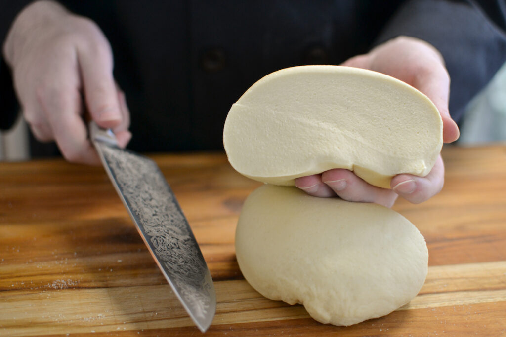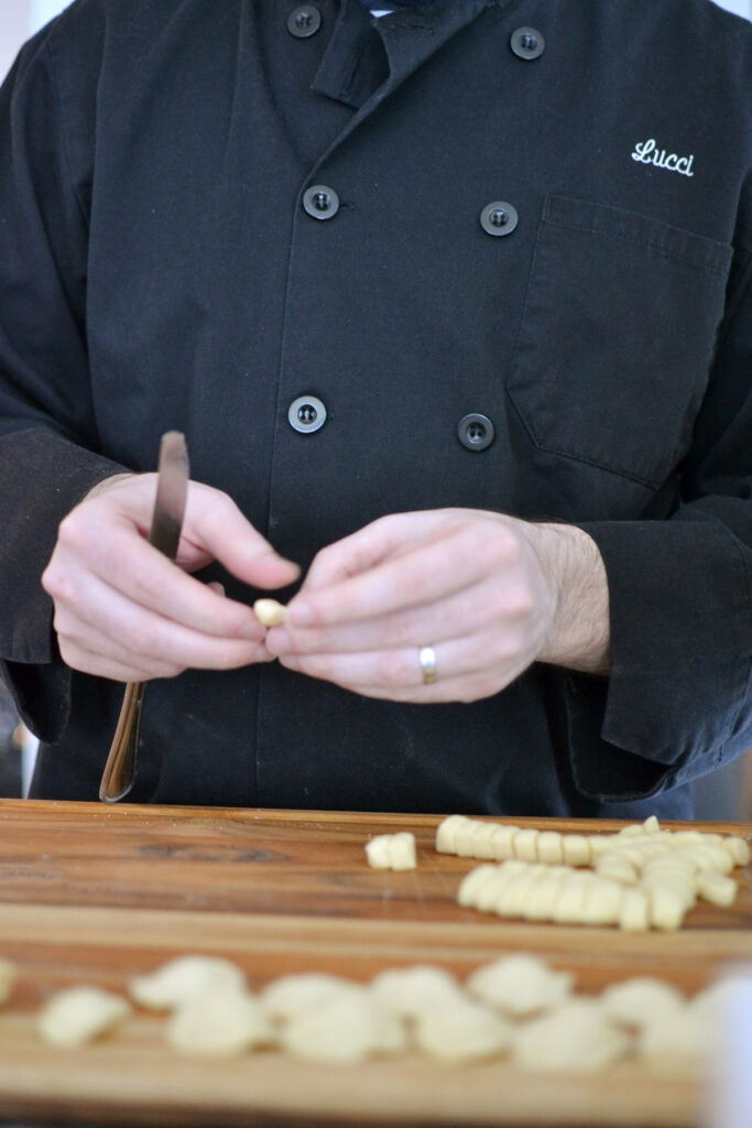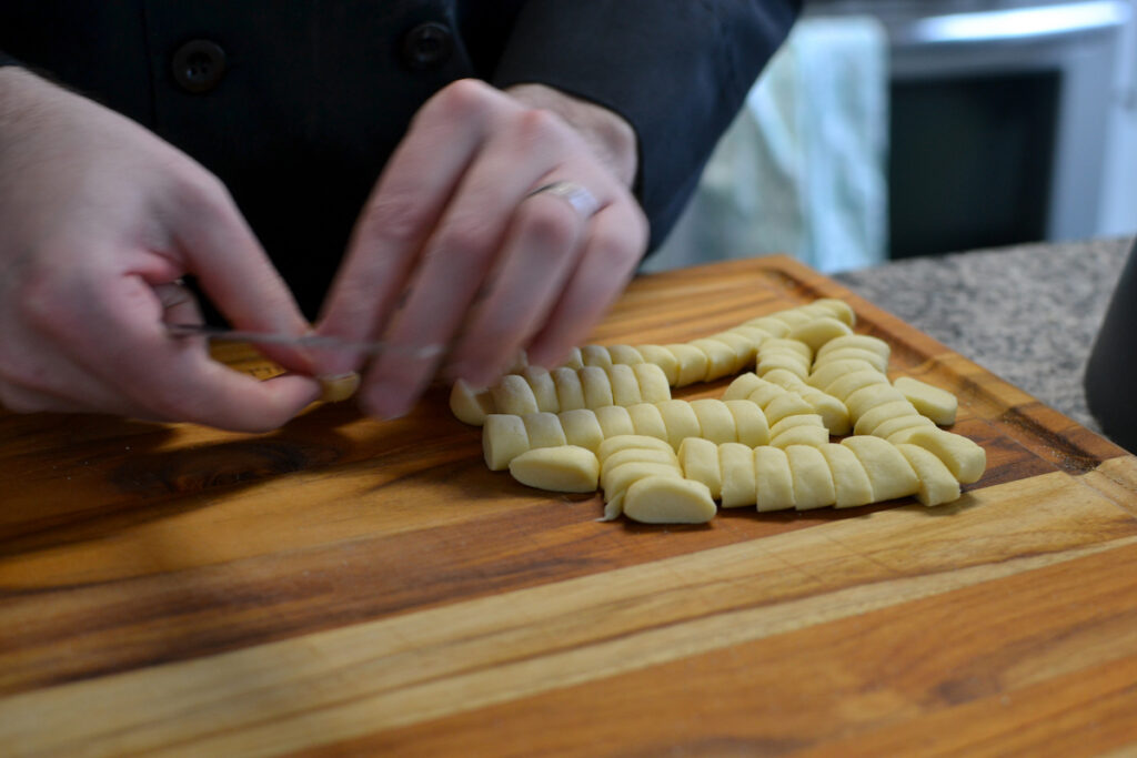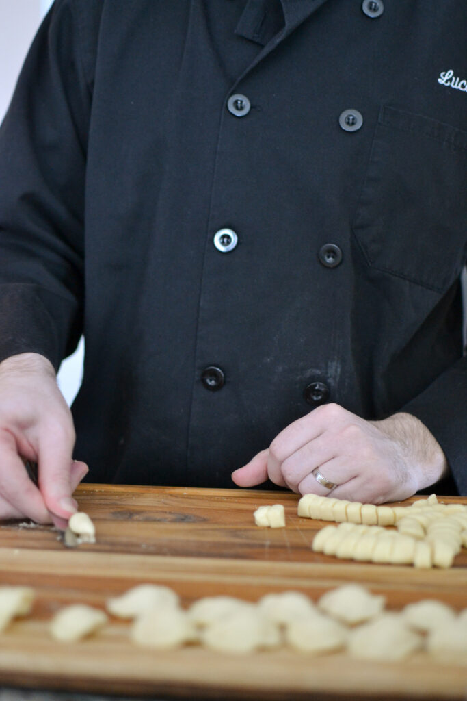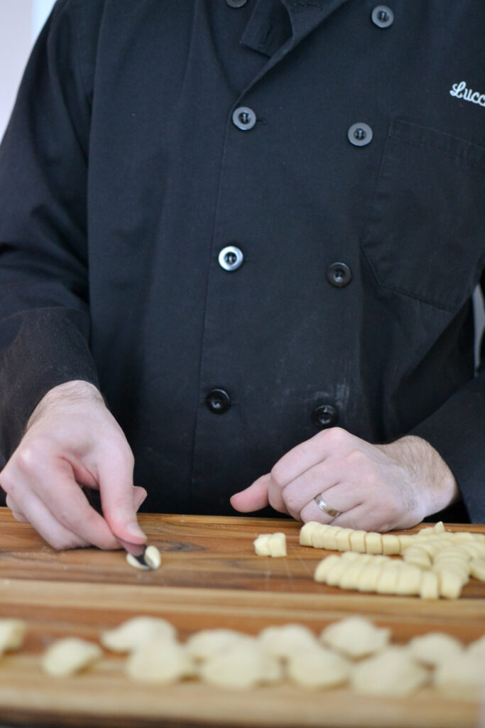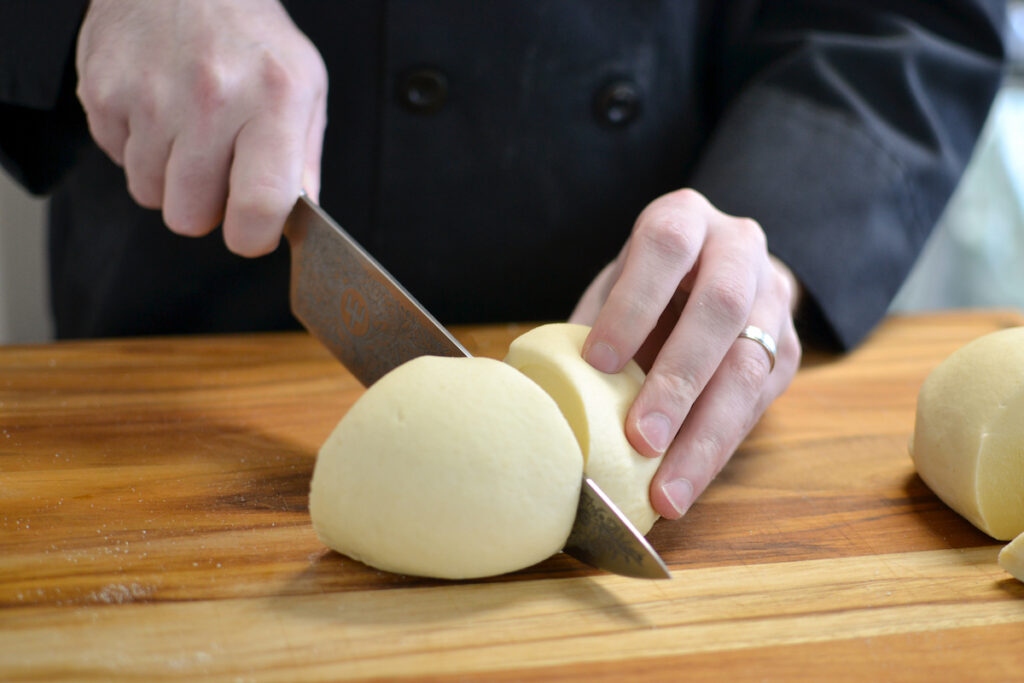 Roll the dough into a snake around 1/2" diameter. With a bench scraper or knife, cut the dough into 1/4-1/2" pieces depending on the final size you would like. Place the a dull knife on the edge of the dough and press down, dragging the dough. Remove from the knife and fold inside out to create an 'ear' shape.