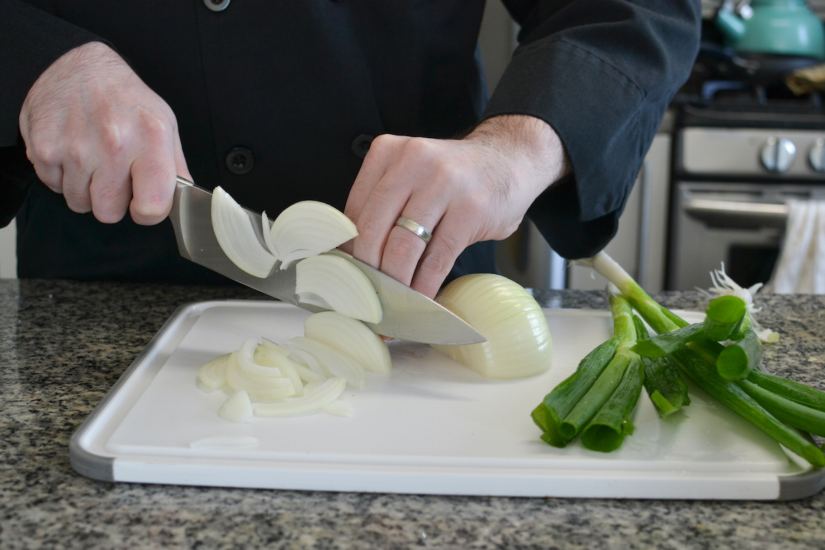 Cut the onion in half, remove the root and slice perpendicular to the root (so you end up with long pieces that will hold their shape better when cooked).