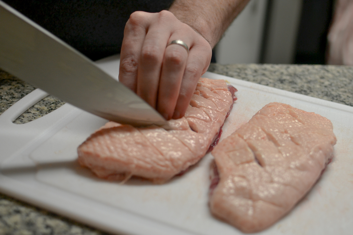 Store the rendered fat in a mason jar in the fridge and use for potatoes, vegetable etc. *Duck is very fatty, we start in a cold skillet so we can render out the fat.