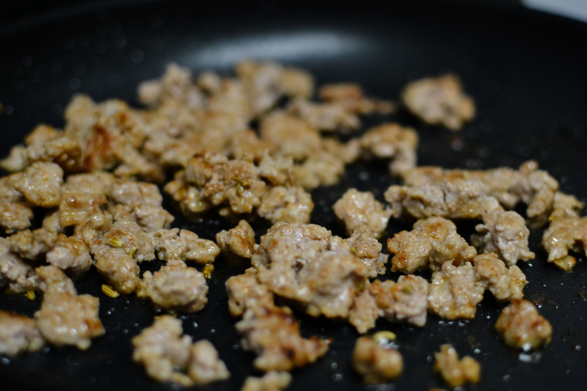In a skillet over medium-high heat brown the sausage, breaking into small pieces.