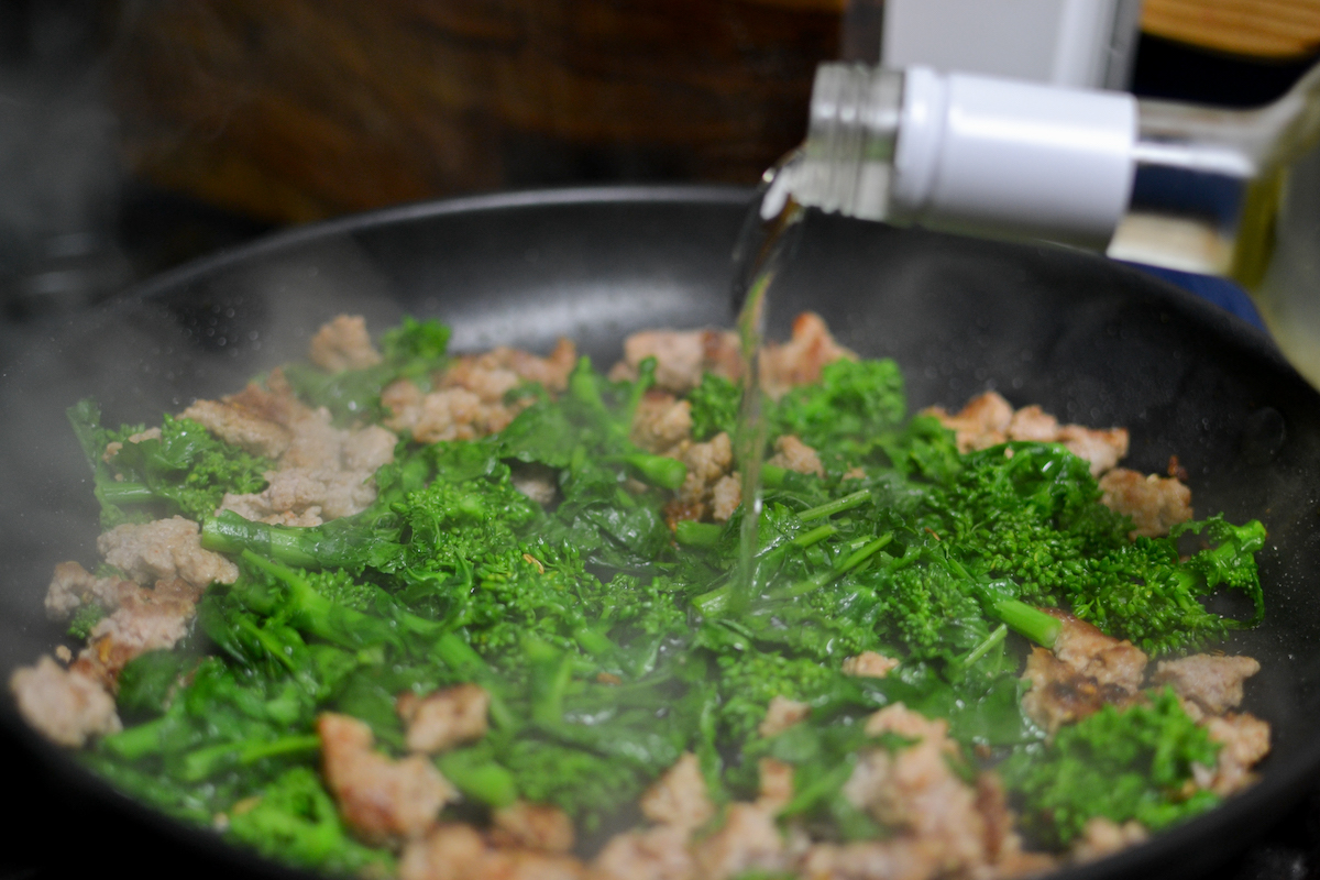 Once the broccoli is added to the sausage add the white wine. Reduce the heat to medium and let simmer for a minute. Add the butter then cover.