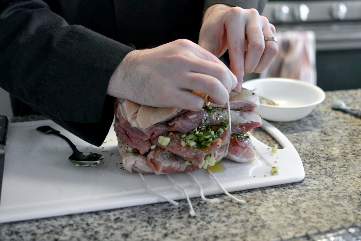 Place strings of kitchen twine one inch apart under the pork belly. Tightly roll the pork and tie the end. Repeat until fully tied and wrapped.