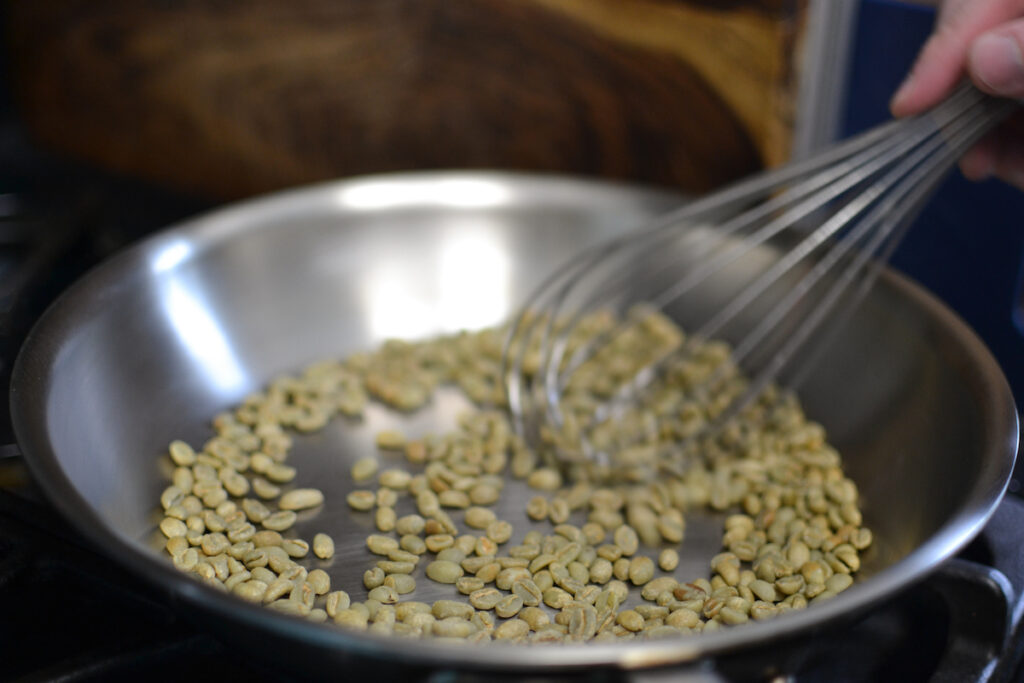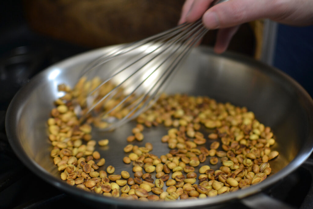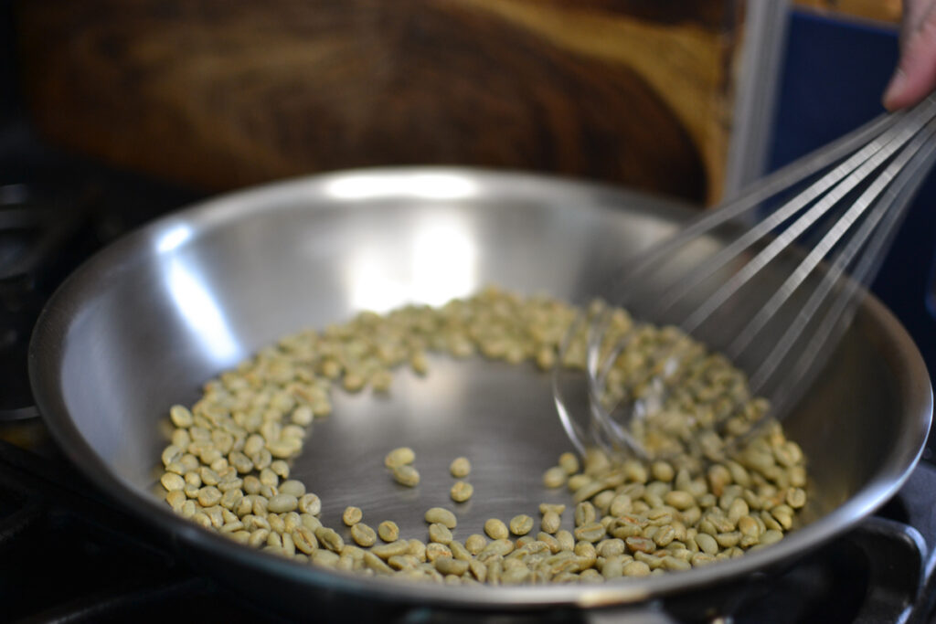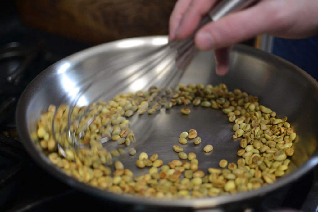 Add the coffee to the skillet. Whisk for 30 seconds then toss for 20 seconds. Repeat for 7-10 minutes until you hear the coffee start to crack. It will sound similar to popcorn popping. The combination of whisking and tossing will ensure even roasting.