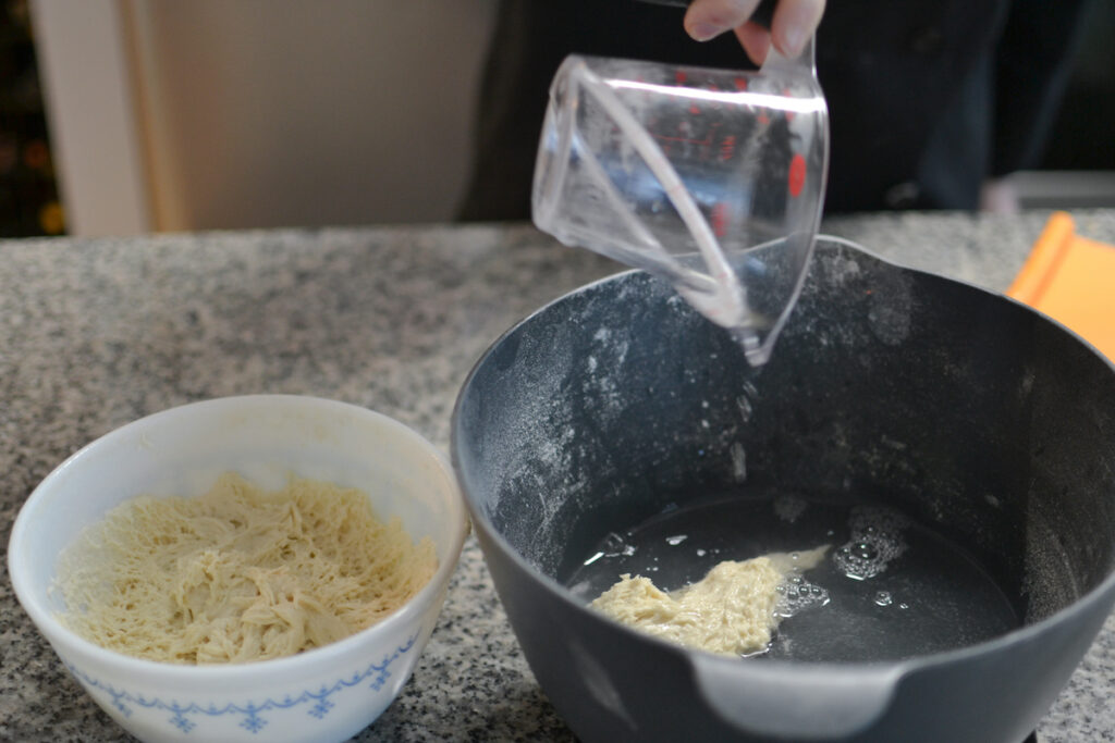 Add 4 cups of warm water to a bowl and sprinkle in the sugar without mixing. We want the sugar to be on the bottom. Taking from the middle of the stiff starter, cut into 4 equal parts. Squeeze the dough to remove any excess air. Add to the water and let sit for 20 minutes.