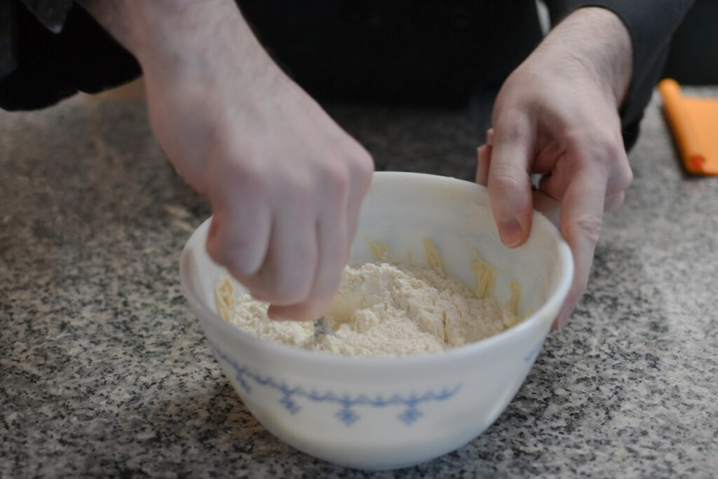 See gallery for more pictures on kneading and rolling it out. The dough will be sticky but resist adding more flour. Instead rely on the bench scraper to help unstick the dough from the counter. You have to go quick when rolling. If you let the rolling pin rest of the dough for a few seconds it will start to stick. -