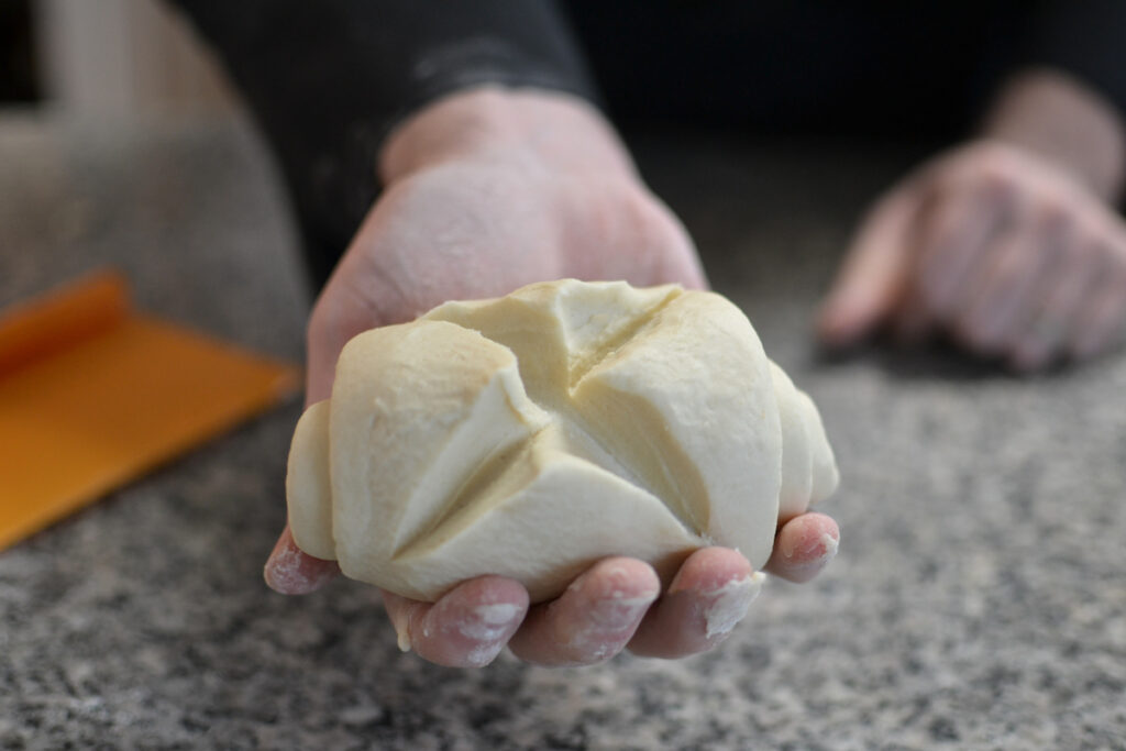 Use a rolling pin to roll out the dough into a strip. Use a bench scraper to help unstick it from the counter and fold in half then half again. Rotate the dough and repeat rolling out out. Do this a couple times until the dough is smooth. The final strip should be around 23x3 inches (60x8 cm). Next roll the dough lengthwise. Cut an X into the top and cover.