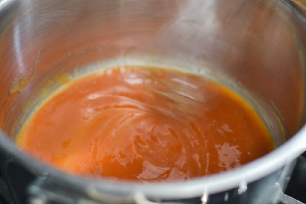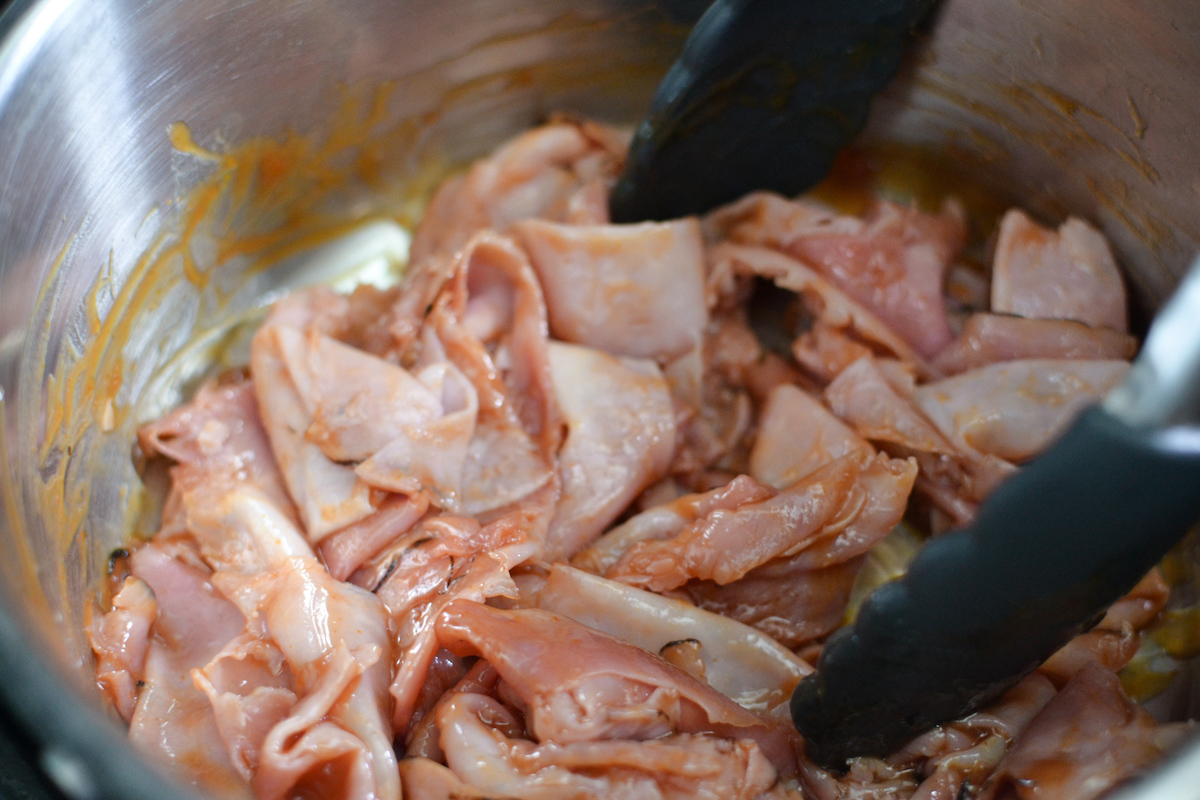 Once the sauce is thickened stir in the ham to coat it. Cover with a lid and cook for another 5 minutes to warm the ham.