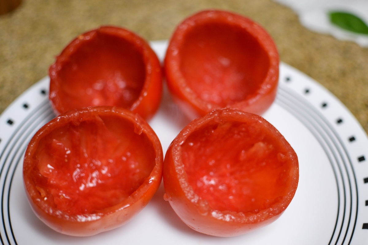 Start by cutting the tops off the tomatoes and set aside. Remove the core and toss. Hollow out the rest of the tomato with a knife and spoon. Being cautious not to pierce the tomato or get it too thin. It still needs to hold its shape. Lightly salt the inside then cover and place in the fridge until ready to use.
