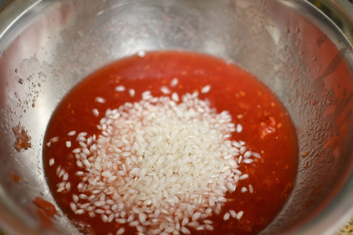 Using a fork to smash the tomato guts into a liquid. Remove and large chunks. Add salt, basil leaves and rice. Mix and set in the fridge for at least 30 minute but up to a couple hours. This will help the rice absorb some of the liquid and cook more evenly.