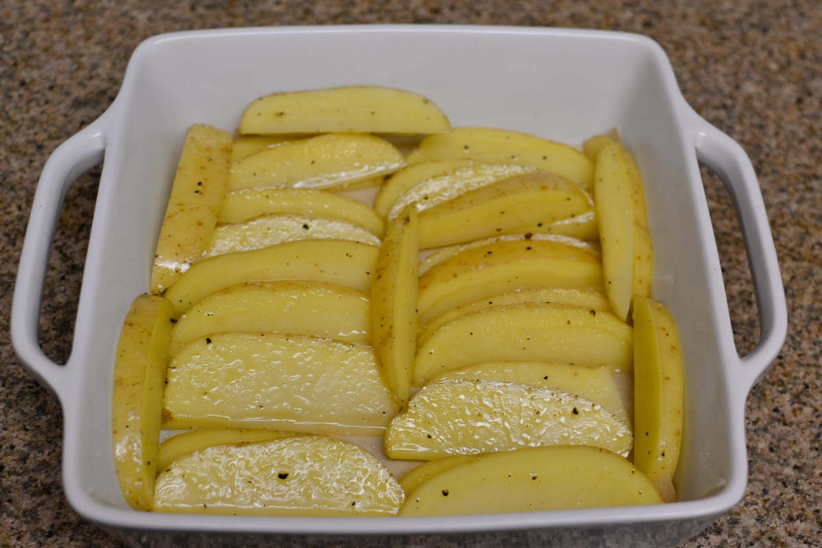 Cut the potatoes into thin wedges then place in a bowl of cold water for 20 minutes. Drain and dry off completely. Toss in a bowl with 2 tbsp olive oil, salt and pepper. Add to a 9x9 baking pan lined with parchment paper.