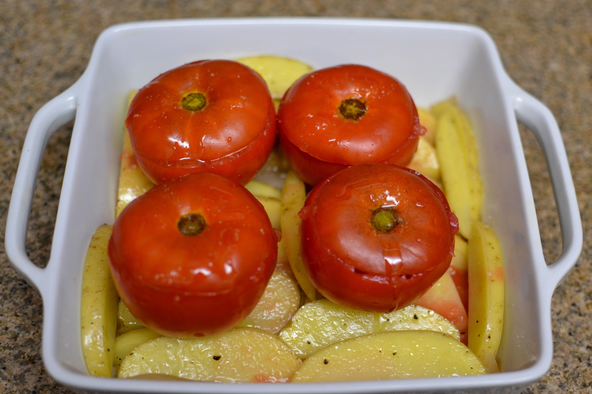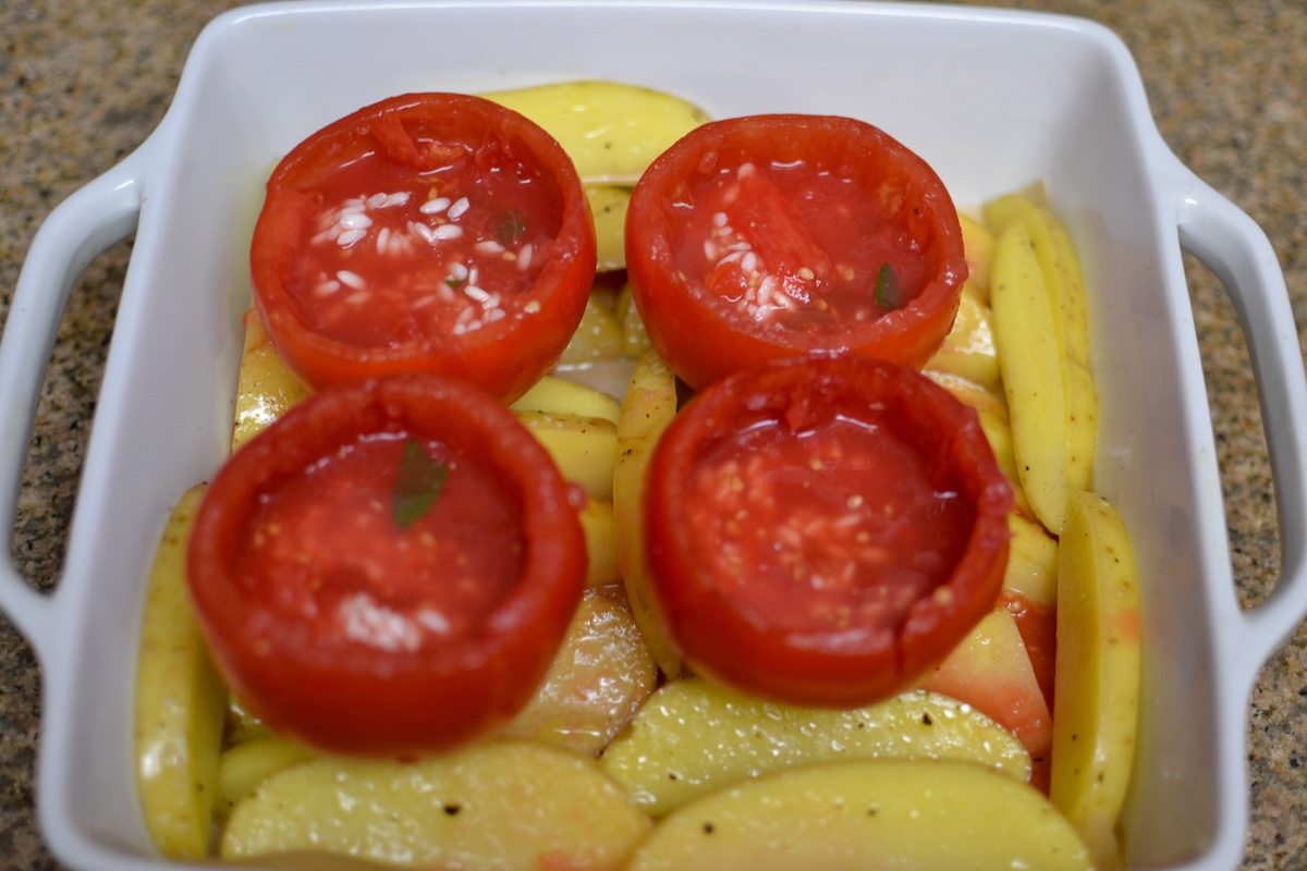 Slow baked ripe tomatoes filled rice, tomato juice and basil overtop of wedge potatoes.