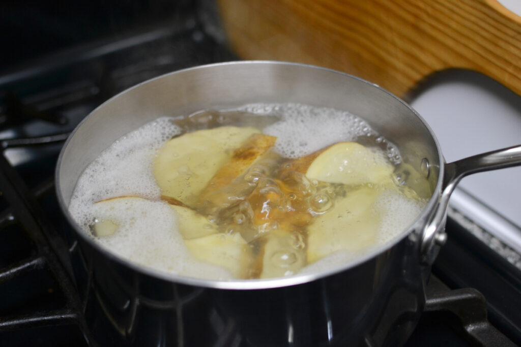 Rinse and scrub the potatoes. Cut in halves or quarters, depending on the size of the potatoes, and place into a pot of cold salted water. Bring to a boil and cook for 30 minutes or until the potatoes are tender. Drain and let the potatoes cool.