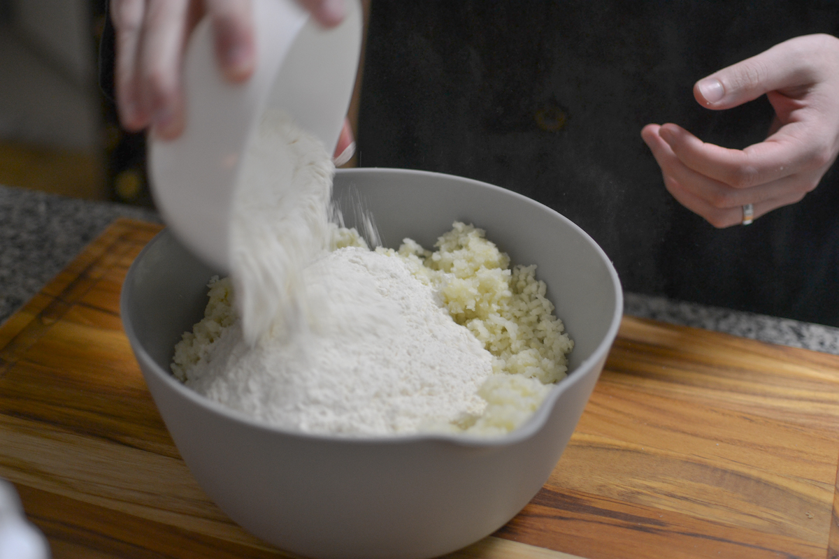 In a large boil mash the potatoes using a potato ricer. Add the flour, egg and salt. Gently mix just to combine. Over mixing or kneading will lead to hard and chewy gnocchi.