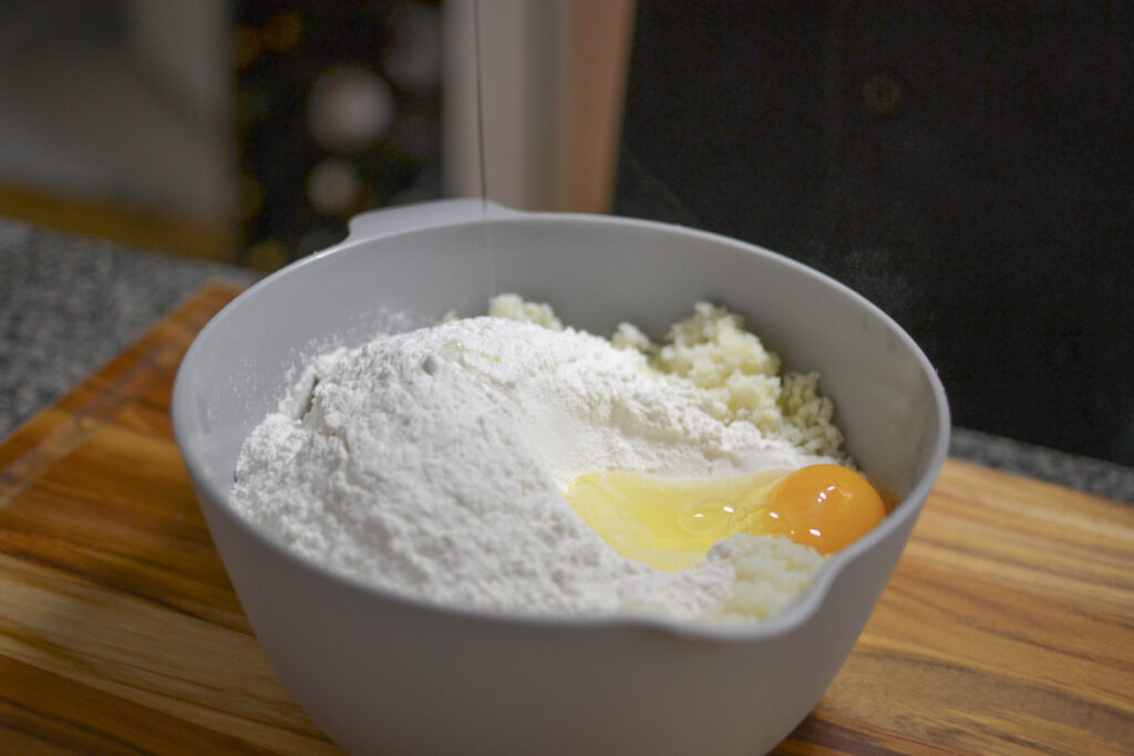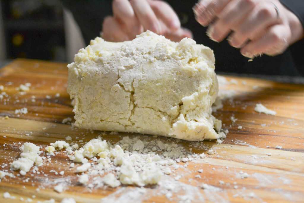 Transfer the mixture to a counter or work surface. Unlike regular pasta dough we do not want gluten to form. We simply want to combine all the ingredients. Gently knead for a couple minutes to form the ball of dough.