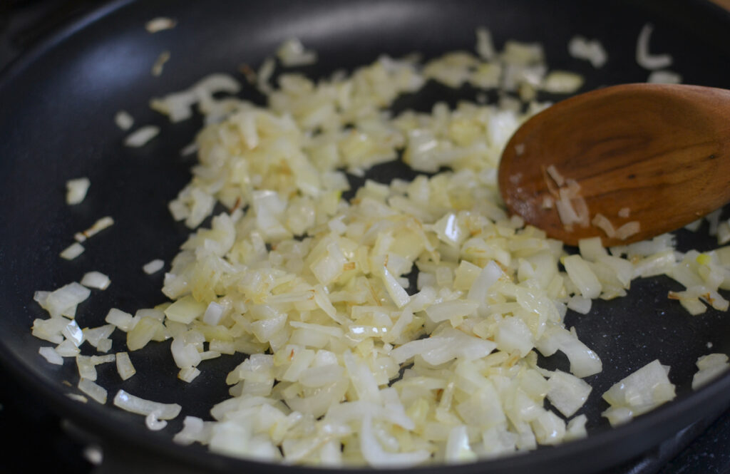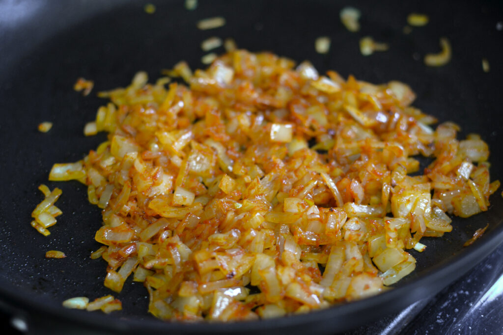 Dice the onion and place it in a pan with lard or butter. Sweat an onion then add the sugar, cinnamon, nutmeg and tomato paste. Cook for 10 minutes on low or until the onions are very soft.