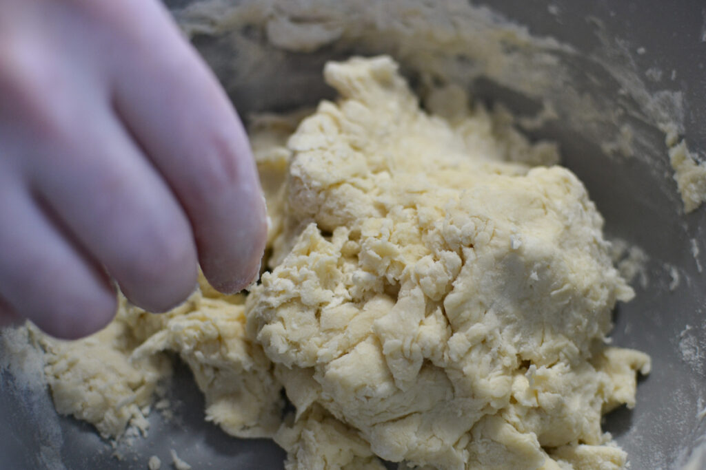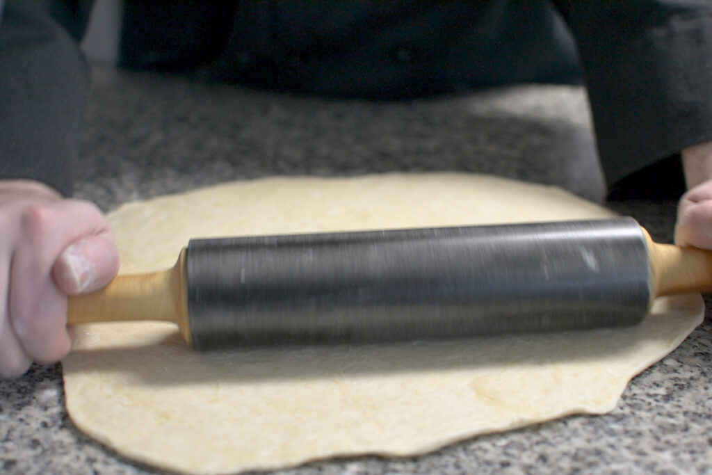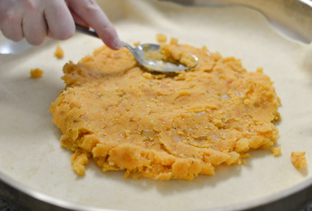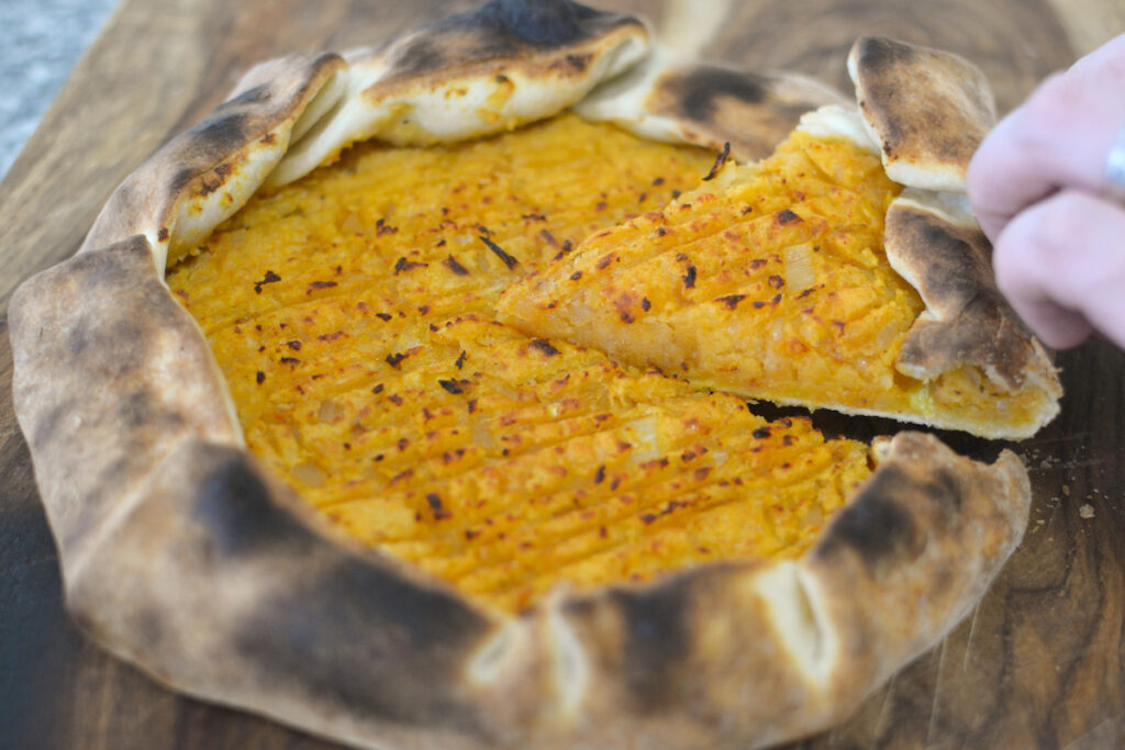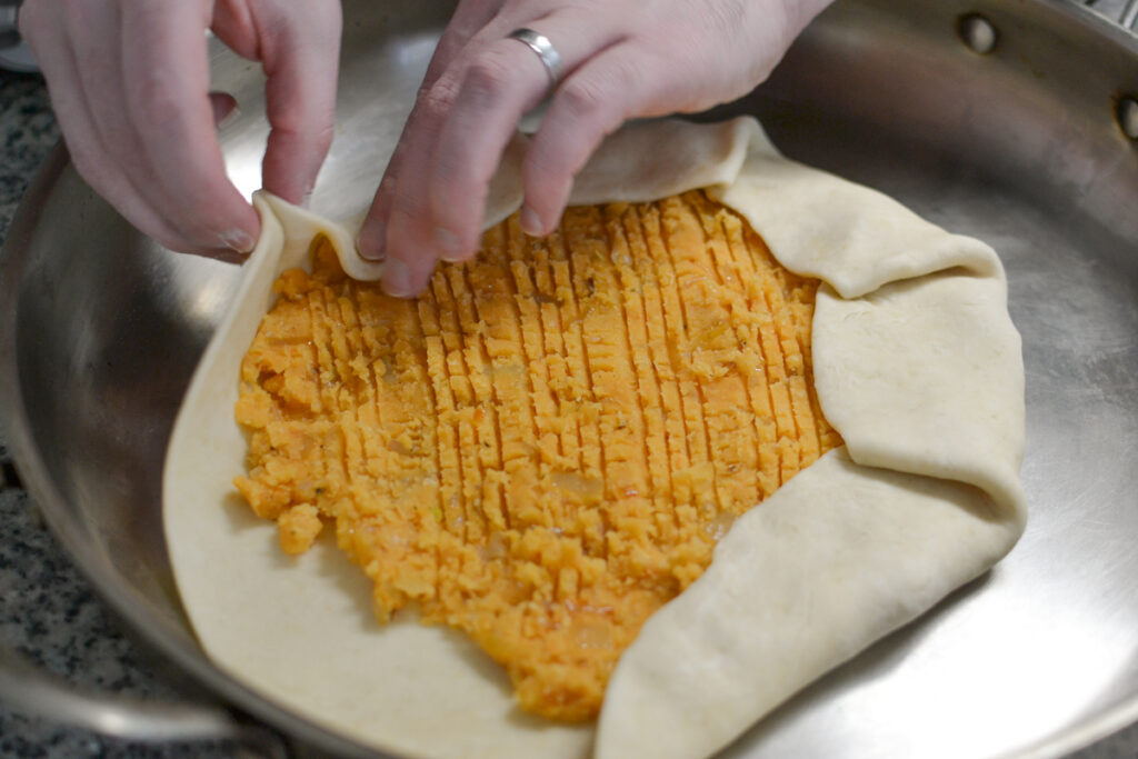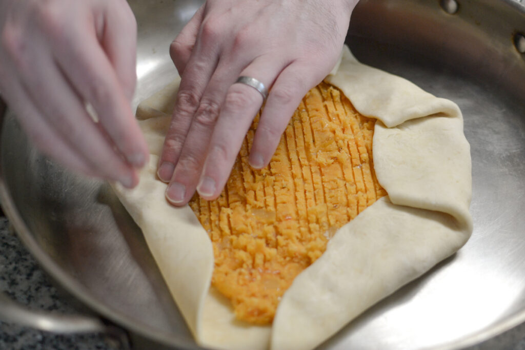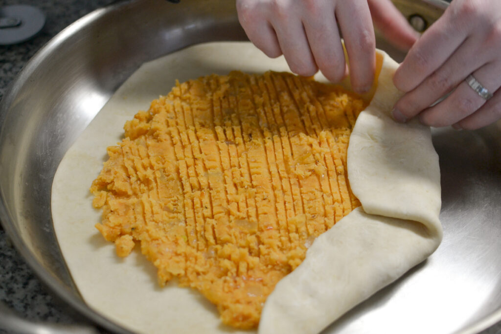 Roll out dough to 3mm thick. Place in a pan or on a pizza pan. Add the filling in the center and pat down to even it out. Using a fork make lines in the filling. This will create more surface area and a more crispy top. Trim the edges and fold the dough over the filling.