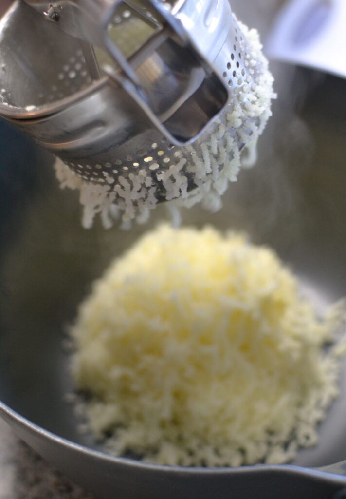 Roast the potatoes until very soft. Rice or mash the potatoes and add the onion mixture. Add the cheese, salt and pepper. Taste and add more cheese, salt and pepper as needed.
