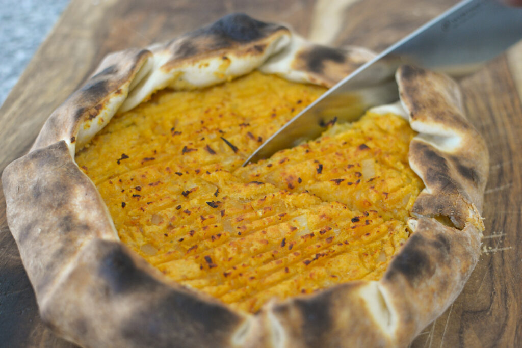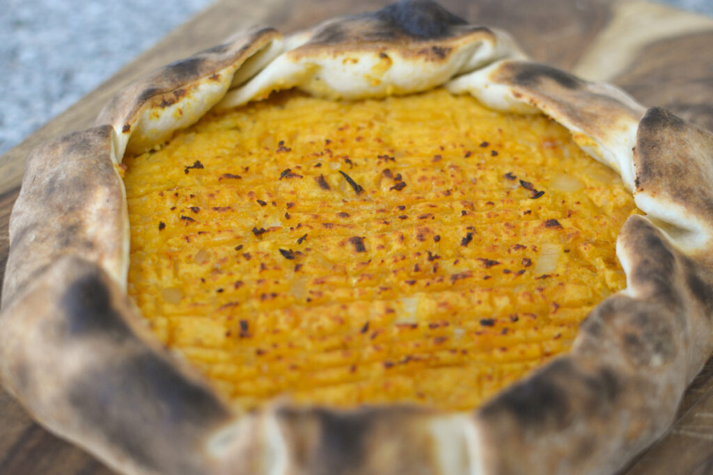 A creamy potato and onion filling cooked with a dough that is a cross between a short crust and pizza dough.