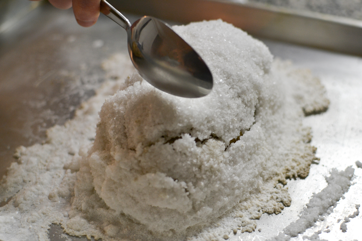When it comes to the type of salt, use something cheap but a coarse salt. The hardest part of this recipe is getting the salt mixture just right. This will heavily depend on the salt you use and the measurements provided are just guides. You will want to add just enough water to form a wet sand like texture.
