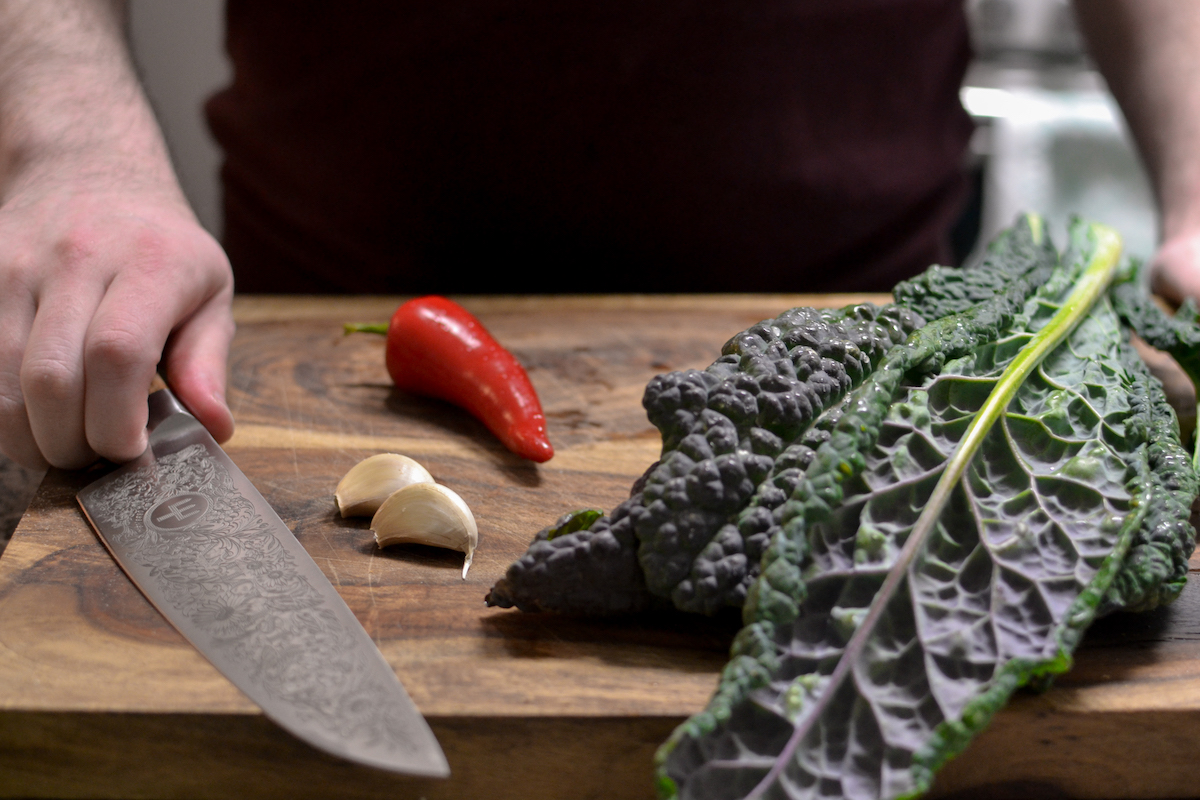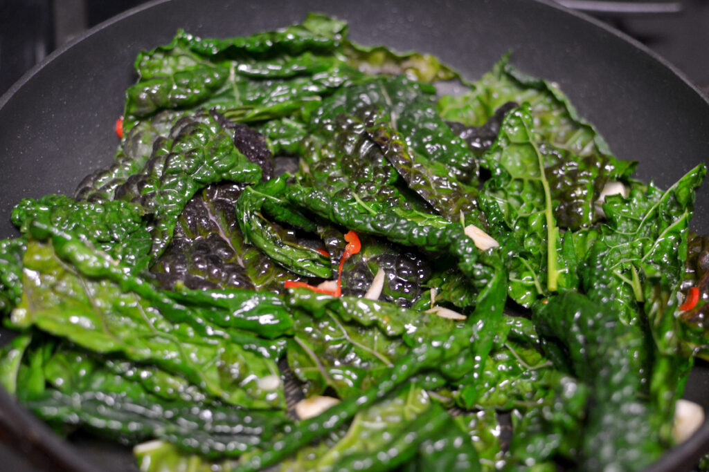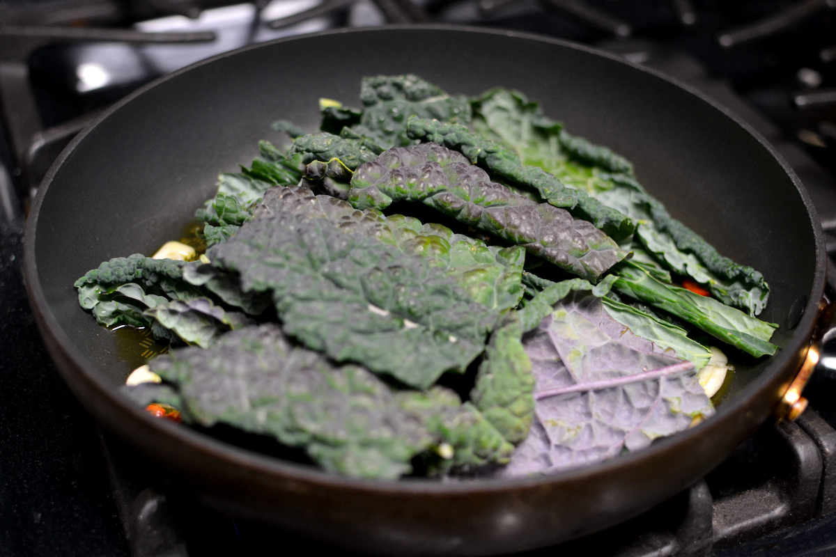 Add a tablespoon of extra virgin olive oil to a skillet placed over medium-high heat. Add the garlic and chili, cooking until the garlic just starts to turn golden. Toss in the kale and a sprinkle of salt. The kale will stop the garlic from burning. Sauté for 10 minutes or until the kale is tender.