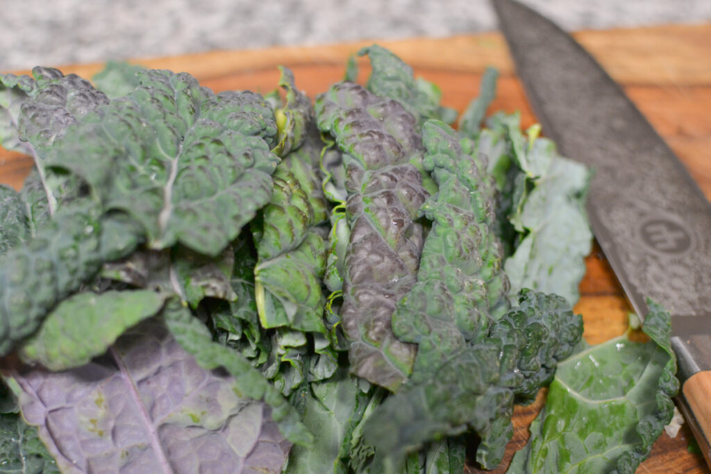 I like to remove the fibrous stems from the kale before cooking, but this step is optional.