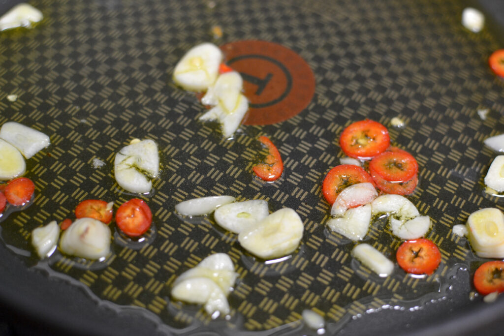 Slice the garlic and chili and set aside. If you don't want it too spicy you can remove the seeds from the chili pepper.
