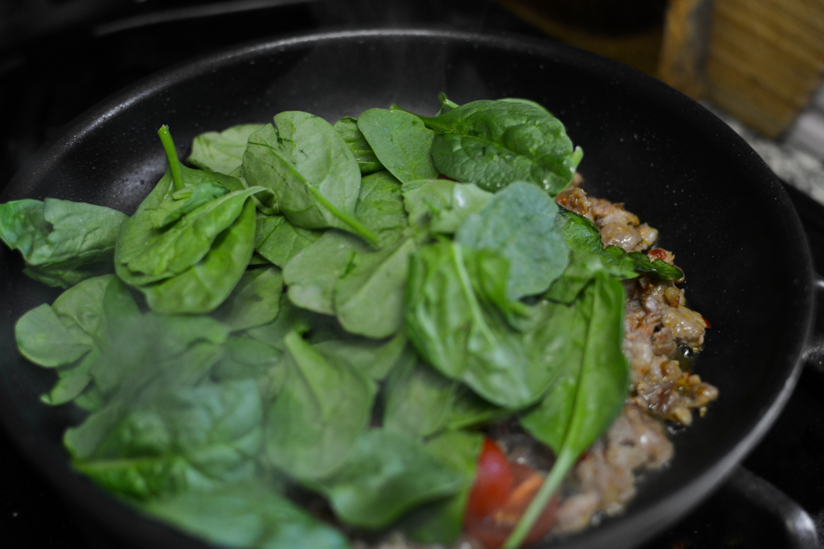 Once the sausage is browned, add the chili pepper, halved cherry tomatoes, wine and spinach. Season with salt and pepper. Reduce heat to medium low and cover with a lid. Cook for another 5 minutes.