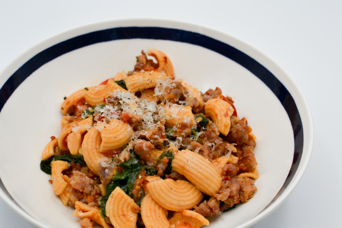 This spicy pasta dish is packed full of flavor and the perfect weekday meal. Lumaca rigata is the perfect pasta shape because the holes get filled with the browned sausage and sauce.