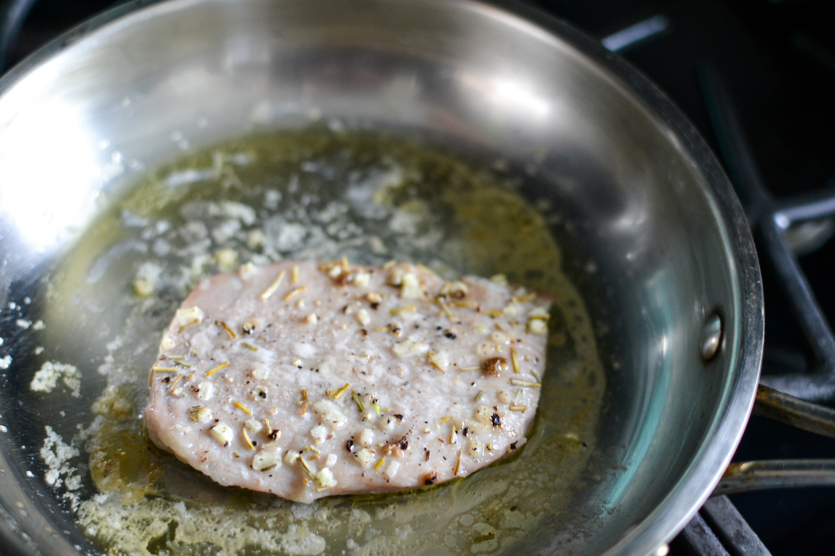 The pork needs to be prepared 2 days ahead of time. Generously season both sides of the pork with salt, pepper, garlic and rosemary. After 2 days place the pork in a saucepan with a teaspoon of butter on 350. Let cook for 15 minutes or until the pork reaches 160 F.