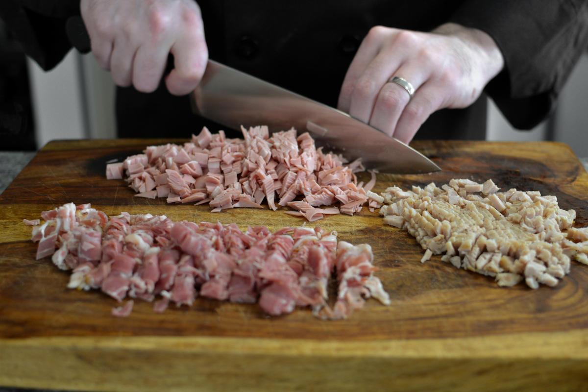 Remove the seasoning from the pork. Thinly chop the pork, prosciutto and mortadella.