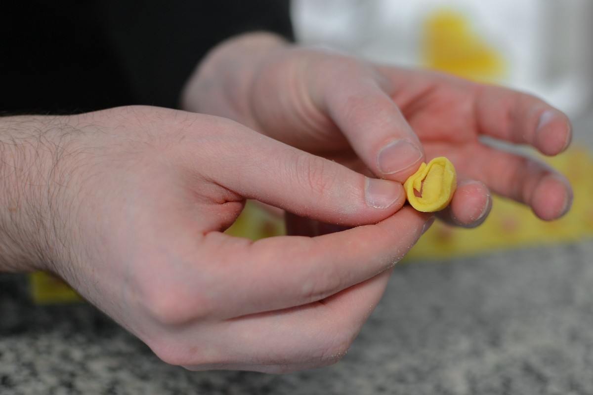 Fold the tortellini to form a triangle, pressing out the air and press the filling to the center. Slightly fold the triangle tip towards the center then wrap the other 2 ends around your finger to form a ring.