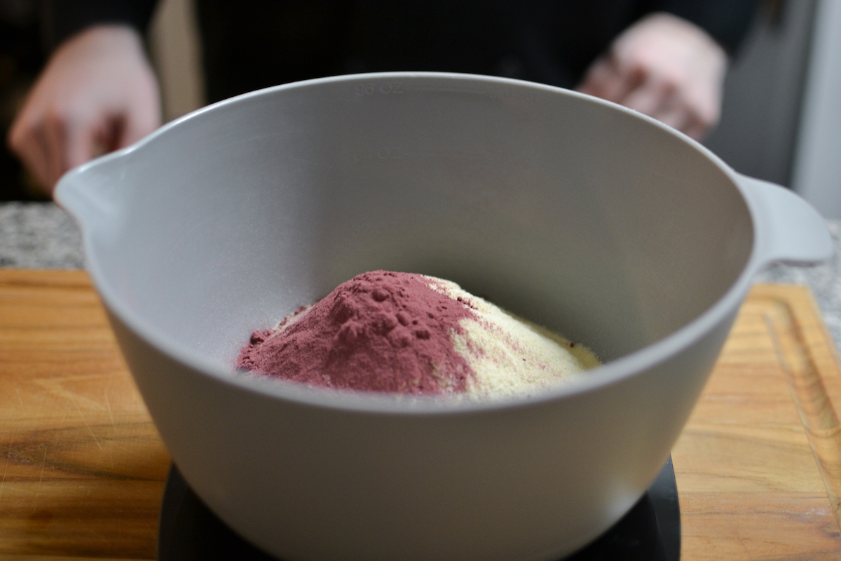 Weigh out your flour and water, making sure the water is very warm. Place in the beetroot powder and mix together in a bowl into a shaggy dough starts to form.
